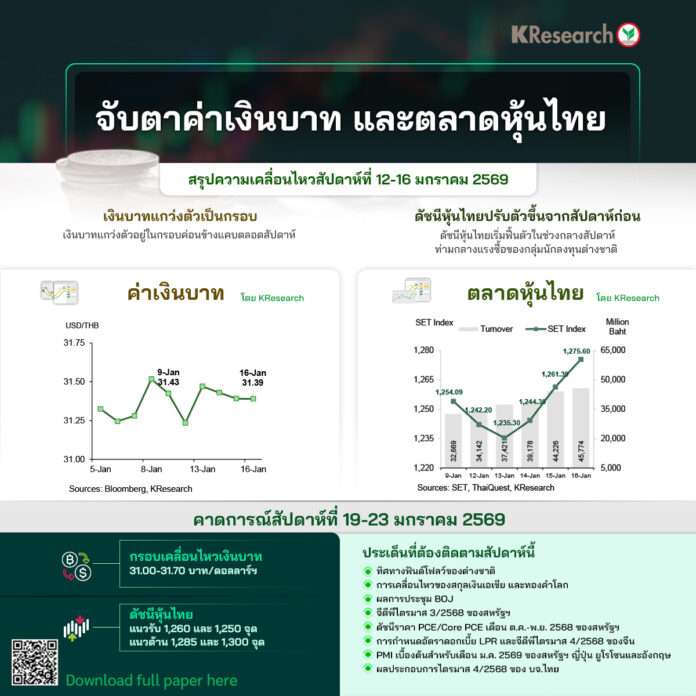 กรุงเทพฯ, วันที่ 17 ม.ค. – ศูนย์วิจัยกสิกรไทยวิเคราะห์สถานการณ์ค่าเงินบาท และตลาดหุ้นไทย โดยระบุว่าสัปดาห์ที่ผ่านมา (12 – 16 ม.ค.) เงินบาทแกว่งตัวอยู่ในกรอบค่อนข้างแคบตลอดสัปดาห์ ขณะที่ ดัชนีหุ้นไทยปรับตัวขึ้นจากสัปดาห์ก่อน โดยเริ่มฟื้นตัวในช่วงกลางสัปดาห์ท่ามกลางแรงซื้อของกลุ่มนักลงทุนต่างชาติ