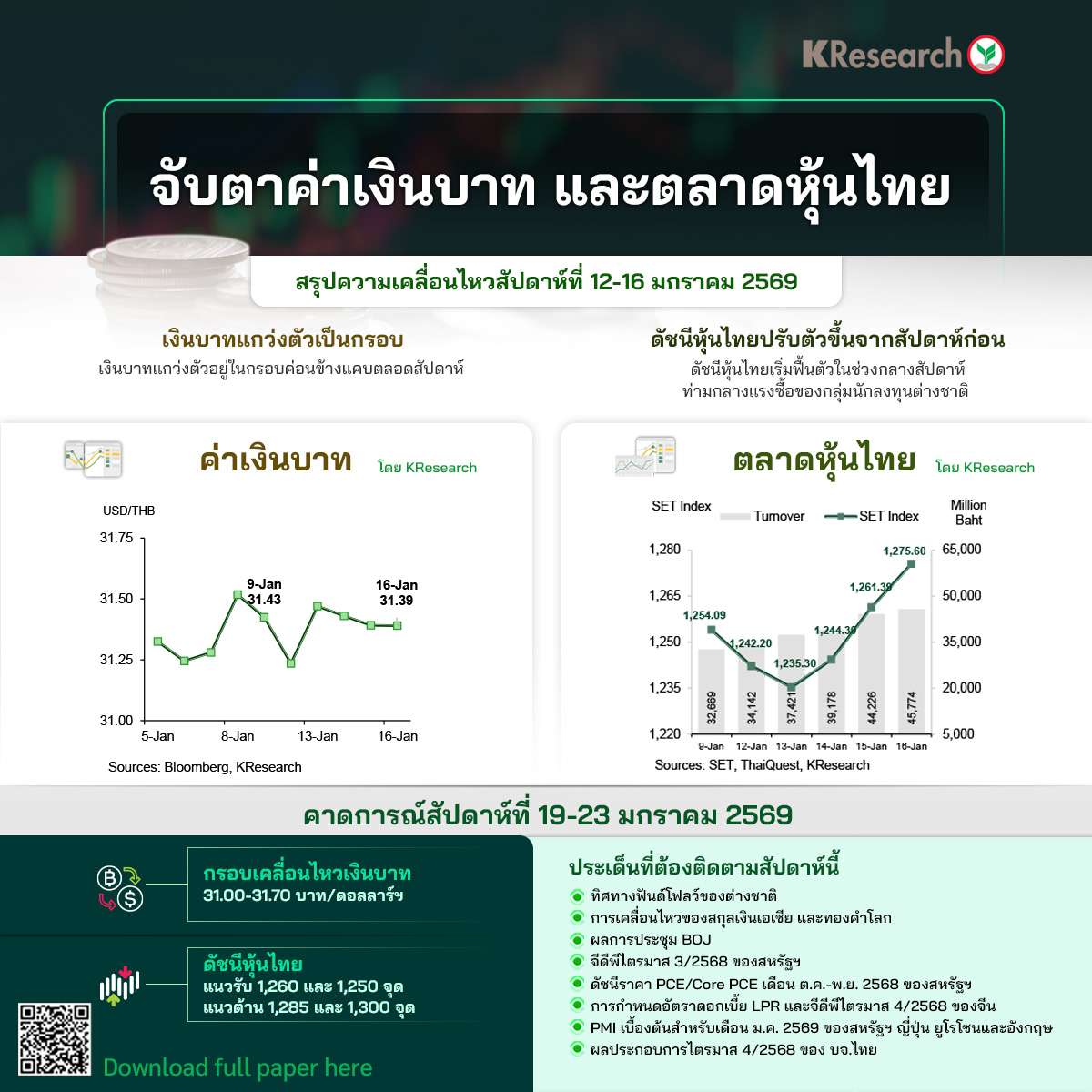 โดยสัปดาห์หน้า (19 – 23 ม.ค.) ศูนย์วิจัยกสิกรไทยคาดกรอบการเคลื่อนไหวของเงินบาทที่ 31.00 – 31.70 บาท/ดอลลาร์ฯ ส่วนดัชนีหุ้นไทย แนวรับที่ 1,260 และ 1,250 จุด แนวต้านที่ 1,285 และ 1,300 จุด