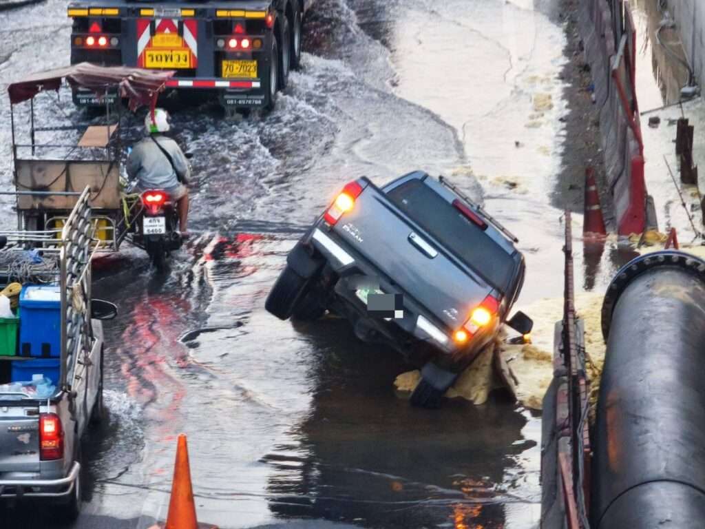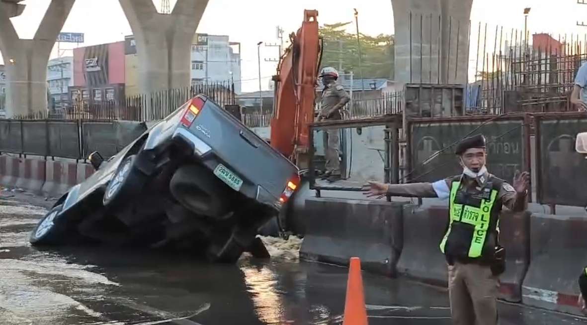 ทั้งนี้จึงได้แจ้งให้ พ.ต.ต.พชรพล เผ่าสำราญ สารวัตรจราจร สภ.เมืองสมุทรสาคร พร้อมกำลังเจ้าหน้าที่ตำรวจจราจร เข้าตรวจสอบ โดยบริเวณที่เกิดเหตุพบรถยนต์กระบะแคป สีเทาดำ ยี่ห้อ อีซูซุดีแม็ก ทะเบียน 2ฒช 5885 กรุงเทพมหานคร ล้อขวาหน้ารถตกอยู่ในหลุมมีขนาดกว้างประมาณ 1 เมตร ยาวประมาณ 1.5 เมตร ลึกราวๆ 1 เมตร ส่วนล้อที่เหลือลอยจากพื้นถนน จนหวั่นว่ารถอาจจะพลิกตะแคงได้