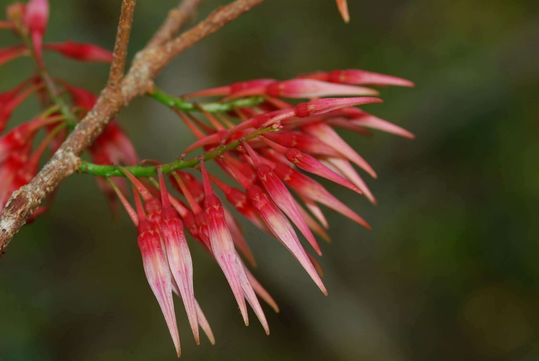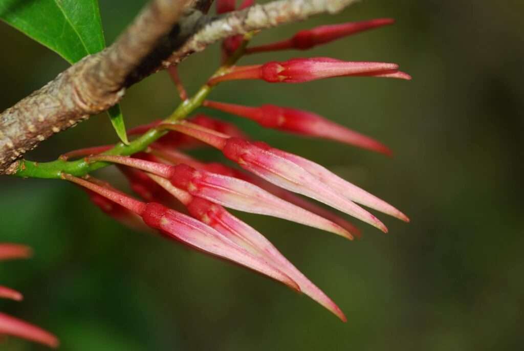 สะเม็กไม่ใช่ดอกไม้ที่พบเห็นได้ริมทาง หากแต่ซ่อนตัวอยู่บนยอดดอยและภูเขาสูง เป็นไม้พุ่มหรือไม้พุ่มอิงอาศัยที่สามารถเติบโตได้สูงถึงราว 2.5 เมตร มักเกาะอาศัยอยู่ตามต้นไม้ใหญ่ ลานหิน หรือหน้าผาสูง ใบเดี่ยวเรียงเวียนรอบกิ่งอย่างเป็นระเบียบ แต่สิ่งที่สะกดสายตาที่สุดคือช่อดอกแบบช่อกระจะ สีแดงสดหรือชมพูเข้ม ตัดกับพื้นป่าสีเขียวและท้องฟ้าอย่างชัดเจน พร้อมริ้วสีแดงเข้มที่ช่วยขับความงามให้โดดเด่นยิ่งขึ้น