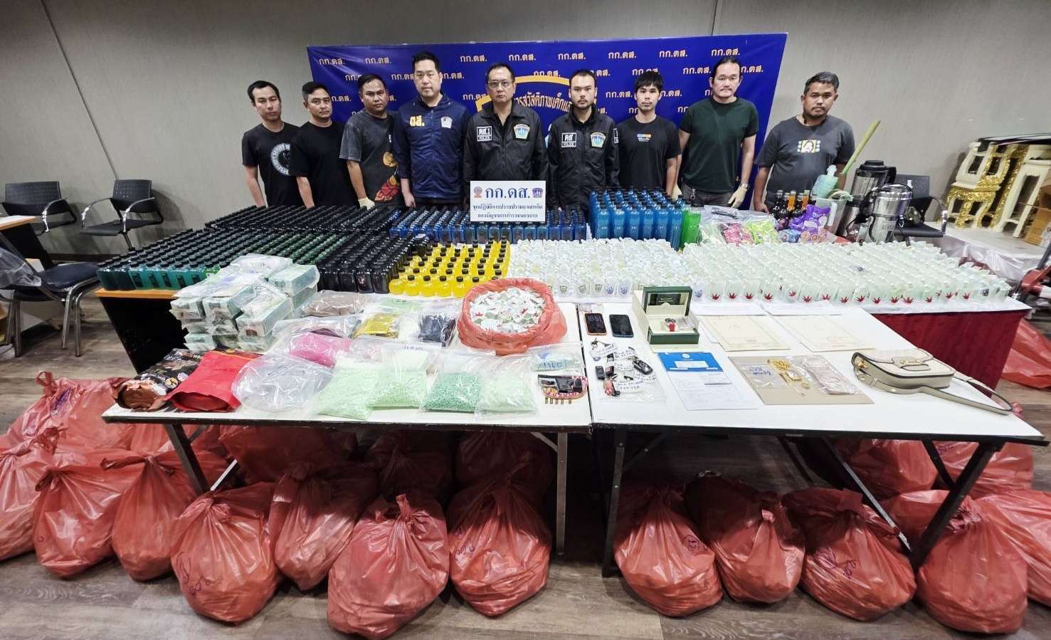 ตำรวจ กก.ดส. เปิดปฏิบัติการจับกุมขบวนการผลิตและจำหน่ายยาเสพติดหลายชนิดในพื้นที่คลองหลวง ปทุมธานี ยึดยาอี MDMA คีตามีน แฮปปี้วอเตอร์ พร้อมอาวุธปืนและทรัพย์สินมูลค่ารวมกว่า 12.5 ล้านบาท