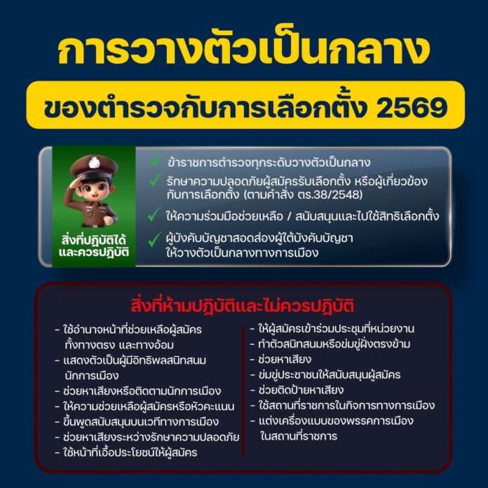 ระบุข้อความ เรื่อง “การวางตัวเป็นกลางของตำรวจกับการเลือกตั้ง 2569” โดยกำหนดให้ข้าราชการตำรวจทุกระดับวางตัวเป็นกลาง เช่น รักษาความปลอดภัยผู้สมัครรับเลือกตั้ง หรือผู้เกี่ยวข้องกับการเลือกตั้ง (ตามคำสั่ง ตร.38/2548) ให้ความร่วมมือช่วยเหลือ สนับสนุนและไปใช้สิทธิเลือกตั้ง นอกจากนี้ให้ผู้บังคับบัญชาสอดส่องผู้ใต้บังคับบัญชาให้วางตัวเป็นกลางทางการเมือง