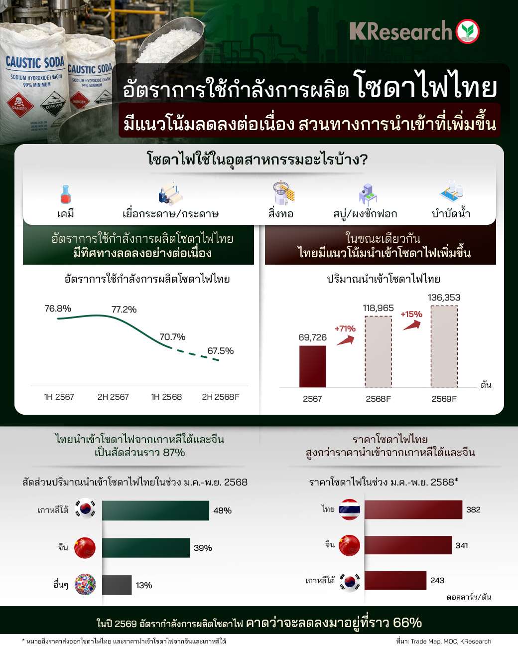กรุงเทพฯ, วันที่ 19 ม.ค. – ศูนย์วิจัยกสิกรไทยประเมินอัตราการใช้กำลังการผลิตโซดาไฟในไทยมีแนวโน้มลดลงอย่างต่อเนื่อง และคาดจะปรับลงเหลือ 66% ในปี 2569 สวนทางกับการนำเข้าที่เพิ่มขึ้น ทั้งนี้ ไทยนำเข้าโซดาไฟจากเกาหลีใต้และจีนเป็นสัดส่วนราว 87% ในช่วง ม.ค.-พ.ย. 2568 เพราะราคาโซดาไฟไทยสูงกว่าราคานำเข้าจากเกาหลีใต้และจีน