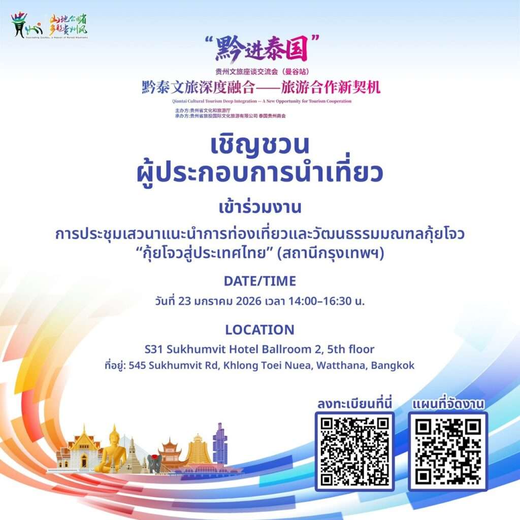 กรุงเทพฯ – มณฑลกุ้ยโจว สาธารณรัฐประชาชนจีน เตรียมยกเสน่ห์การท่องเที่ยวและวัฒนธรรมอันหลากหลาย มาสร้างสะพานมิตรภาพสู่ประเทศไทย ผ่านงาน การประชุมเสวนาแนะนำการท่องเที่ยวและวัฒนธรรมมณฑลกุ้ยโจว “กุ้ยโจวสู่ประเทศไทย” (สถานีกรุงเทพฯ) เปิดพื้นที่แห่งการแลกเปลี่ยน เรียนรู้ และเชื่อมโยงหัวใจของผู้คนสองประเทศ