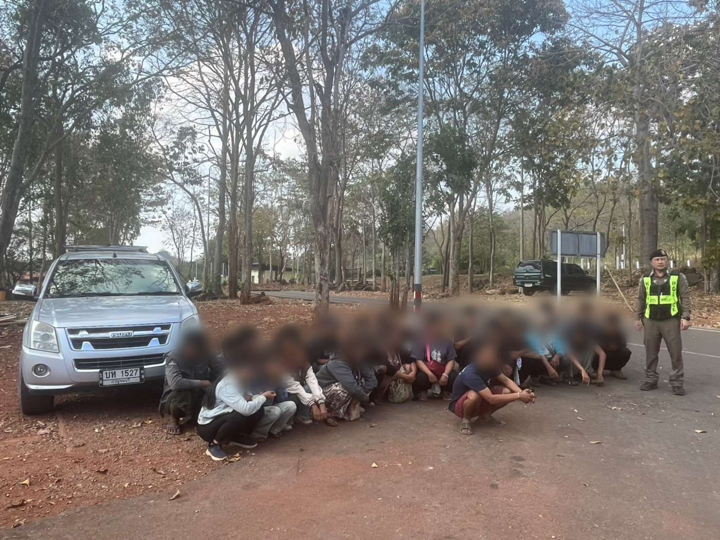 พล.ต.ท.ณัฐศักดิ์ เชาวนาศัย ผบช.ก. พล.ต.ต.พรศักดิ์ เลารุจิราลัย ผบก.ทล.พ.ต.อ.ภคพล สุชล ผกก. 2 บก.ทล. และ พ.ต.ต.กฤษฎา พ่วงปาน สว.ทล.6 กก.2 บก.ทล. ร่วมแถลงผลปฏิบัติการไล่ล่าขบวนการลักลอบขนแรงงานต่างด้าวหลบหนีเข้าเมือง พบบุคคลต่างด้าวสัญชาติเมียนมาพร้อมผู้นำพา ถูกอัดแน่นมาในรถยนต์ รวม 4 คดี รวบแรงงานเถื่อนรวม 83 ราย คดีแรก เจ้าหน้าที่ตำรวจทางหลวง ส.ทล.6 กก.2 บก.ทล. ตรวจพบรถกระบะอีซูซุ ดีแมคซ์ ทะเบียนกาญจนบุรี บริเวณทางหลวงหมายเลข 323 กม.113-114 ต.ท่าเสา อ.ไทรโยค จ.กาญจนบุรี พร้อมจับกุม นายมอน ซาน อายุ 38 ปี สัญชาติเมียนมา เป็นผู้ขับขี่ พร้อมแรงงานต่างด้าวหลบหนีเข้าเมืองสัญชาติเมียนมา จำนวน 25 ราย ถูกอัดแน่นทั้งในห้องโดยสารและกระบะท้ายติดหลังคาไฟเบอร์กลาส