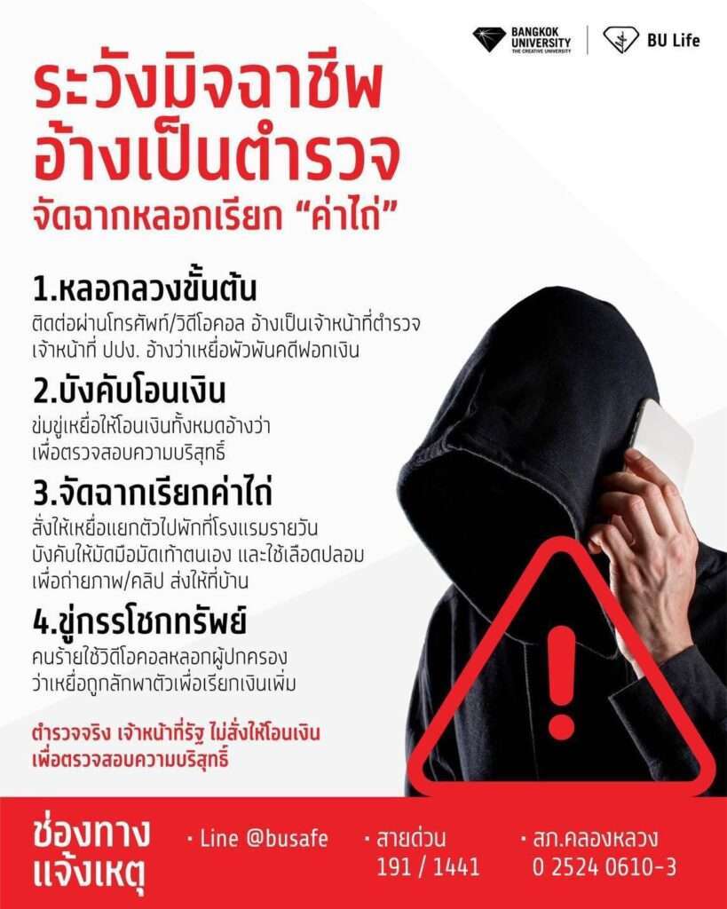 ขณะเดียวกัน มหาวิทยาลัยกรุงเทพได้อนุญาตให้เจ้าหน้าที่ตำรวจทำหน้าที่เป็นวิทยากรหลัก ถ่ายทอดองค์ความรู้ด้านภัยไซเบอร์ พร้อมนำสื่อรณรงค์ของสำนักงานตำรวจแห่งชาติทุกรูปแบบเผยแพร่ภายในมหาวิทยาลัย เพื่อปิดช่องว่างการตกเป็นเหยื่อในระยะยาว
