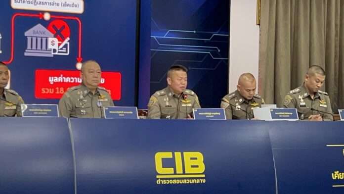 ที่กองบัญชาการตำรวจสอบสวนกลาง (บช.ก.) พล.ต.ท.ณัฐศักดิ์ เชาวนาศัย ผบช.ก. พร้อมด้วย พล.ต.ต.ทัศน์ภูมิ จารุปรัชญ์ ผบก.ปอศ., พ.ต.อ.วิวัฒน์ จิตโสภากุล รอง ผบก.ปอศ., พ.ต.อ.ภัทราวุธ อ่อนช่วย รอง ผบก.ปอศ. และ พ.ต.อ.กริช วรทัต ผกก.5 บก.ปอศ. ร่วมแถลงข่าวผลการจับกุมขบวนการโกงบัตรเครดิต หลอกเพิ่มวงเงินก่อนนำไปใช้รูดซื้อสินค้าราคาสูง สร้างความเสียหายรวมกว่า 18 ล้านบาท