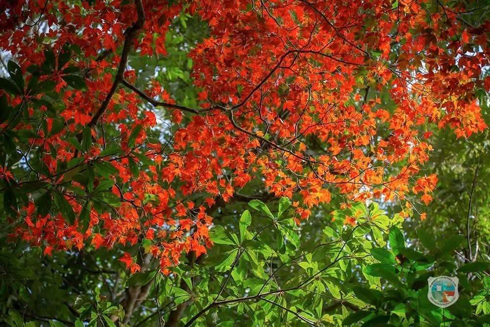 จากสีเขียวชอุ่มตลอดปี ใบก่วมเริ่มผลัดเปลี่ยนเป็นสีแดงสด ไล่เฉดตั้งแต่แดงส้มไปจนถึงแดงเข้ม ดุจเปลวไฟที่แต้มอยู่บนกิ่งก้าน เมื่อแสงแดดยามเช้าส่องกระทบ ใบไม้จะเปล่งประกายราวภาพวาด ทำให้ทั้งผืนป่าดูอบอุ่น นุ่มลึก และโรแมนติกในแบบที่หาดูได้ยากในเมืองไทย