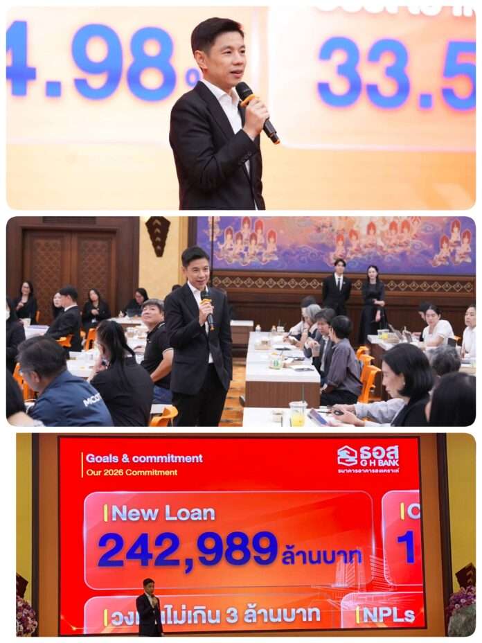 ในวันนี้ สะท้อนจากตัวเลขผลการดำเนินงานปี 2568 สามารถปล่อยสินเชื่อใหม่ได้ 247,241 ล้านบาท 232,058 ราย สูงกว่าเป้าหมาย 4.52% ที่ตั้งไว้ 241,780 ล้านบาท ในจำนวนนี้กว่า 50% เป็นสินเชื่อปล่อยใหม่สำหรับกลุ่มผู้มีรายได้น้อยและปานกลาง วงเงินกู้ไม่เกิน 3 ล้านบาท จำนวน 128,573 ราย ส่งผลให้ ณ สิ้นไตรมาสที่ 4/2568 เทียบกับ ณ สิ้นปี 2567 ธอส. มีสินเชื่อคงค้างรวมทั้งสิ้น 1,891,091 ล้านบาท เพิ่มขึ้น 5.05% สินทรัพย์รวม 2,009,078 ล้านบาท เพิ่มขึ้น 6.62% และเงินฝากรวม 1,760,602 ล้านบาท เพิ่มขึ้น 7.98% ขณะที่หนี้ที่ไม่ก่อให้เกิดรายได้ (NPL) 4.98% ของยอดสินเชื่อรวม เป็นผลจากการแก้ไขหนี้ได้อย่างตรงจุด ด้วยการจัดทำมาตรการช่วยเหลือลูกค้าให้มีภาระในการผ่อนชำระเงินงวดลดลงตามนโยบาย Quick Big Win ของรัฐบาล และ ธอส. มีการตั้งสำรองสูงถึง 155,163 ล้านบาท เพิ่มขึ้น 2.66% หรือคิดเป็นสัดส่วนต่อ NPL ที่ระดับ 164.92% สะท้อนความมั่นคงและความพร้อมในการรองรับการดำเนินงานในอนาคต อัตราส่วนเงินกองทุนต่อสินทรัพย์เสี่ยง (BIS Ratio) ณ เดือนพฤศจิกายน 2568 อยู่ที่ 15.70% สูงกว่าอัตราเงินกองทุนขั้นต่ำที่ธนาคารแห่งประเทศไทย (ธปท.) กำหนดไว้ที่ 8.50%