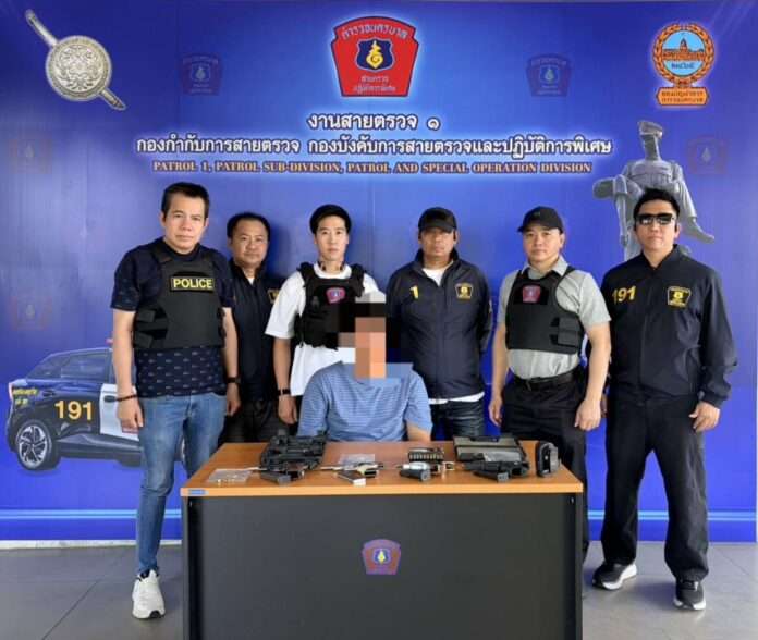 กระทั่งเวลา 11.00 น. พบชายต้องสงสัยถือกระเป๋าเดินมาขึ้นรถของสายลับ เมื่อตรวจสอบพบว่าเป็นอาวุธปืน สายลับจึงส่งสัญญาณให้ ร.ต.อ.เปรมินทร์ ทรงชัยกุล รอง สว. งานสายตรวจ 1 นำกำลังเจ้าหน้าที่เข้าทำการแสดงตัวและตรวจค้น พบอาวุธปืน 3 กระบอก พร้อมเครื่องกระสุนอยู่ภายในกระเป๋า และพบอาวุธปืนอีก 1 กระบอกที่ผู้ต้องหาพกติดตัวมาเจ้าหน้าที่จึงควบคุมตัว นายวทัญญู หรือบอย สงวนนามสกุล อายุ 29 ปี พร้อมของกลาง อาวุธปืน 4 กระบอก และ เครื่องกระสุนปืนขนาดต่าง ๆ รวม 82 นัด