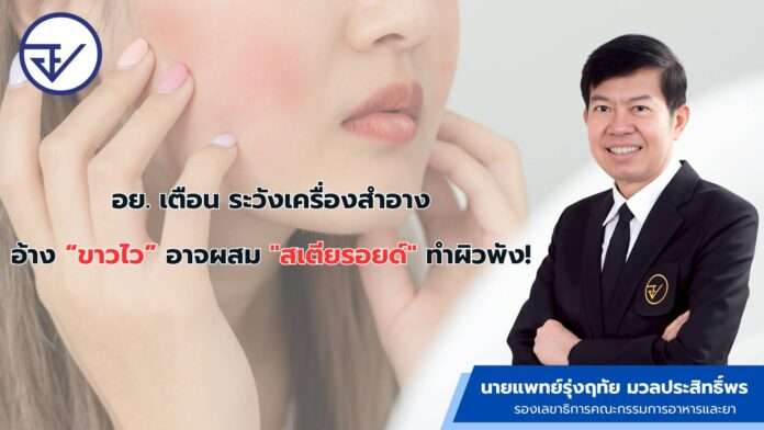 นายแพทย์รุ่งฤทัย มวลประสิทธิ์พร รองเลขาธิการคณะกรรมการอาหารและยา เปิดเผยว่า สำนักงานคณะกรรมการอาหารและยา (อย.) ขอแจ้งเตือนประชาชนให้ระมัดระวังอันตราย จาก “สเตียรอยด์” ซึ่งเป็นสารห้ามใช้ที่มักถูกลักลอบผสมในเครื่องสำอาง การใช้ต่อเนื่องอาจทำให้ผิวบาง เกิดรอยแตก เส้นเลือดใต้ผิวหนังผิดปกติ หน้าแดงตลอดเวลา เกิดผื่นแพ้ เกิดสิวผด ผิวหนังมีสีจางลง หากใช้เป็นเวลานานจะเกิดด่างขาว เสี่ยงต่อภาวะ “ดื้อสเตียรอยด์” แนะนำวิธีสังเกตผลิตภัณฑ์ผสมสารสเตียรอยด์เบื้องต้น มักให้ผลขาวผิดปกติในเวลาสั้น บรรจุภัณฑ์ไม่มีฉลากภาษาไทย ไม่มีเลขที่ใบรับจดแจ้ง และมีการโฆษณาเกินจริง เช่น “ขาวใน 1 คืน” “ขาวใสอย่างรวดเร็ว” หรือ “รักษาสิวฝ้าได้ทันใจ” เป็นต้น ทั้งนี้ หากสงสัยว่าใช้ผลิตภัณฑ์ที่ผสมสารสเตียรอยด์ ให้หยุดใช้ทันทีและรีบปรึกษาแพทย์ผิวหนัง