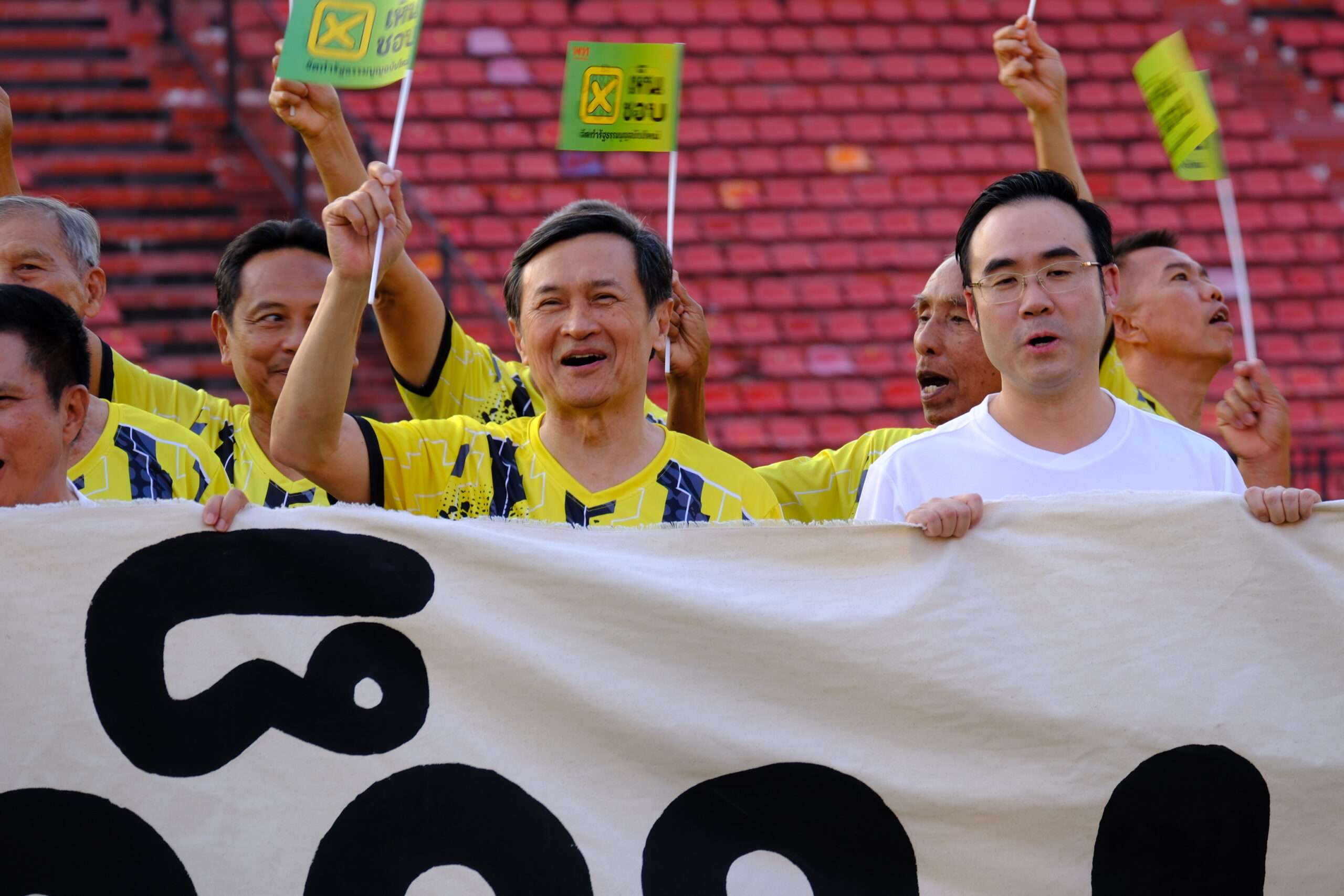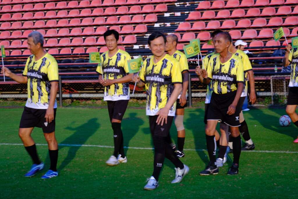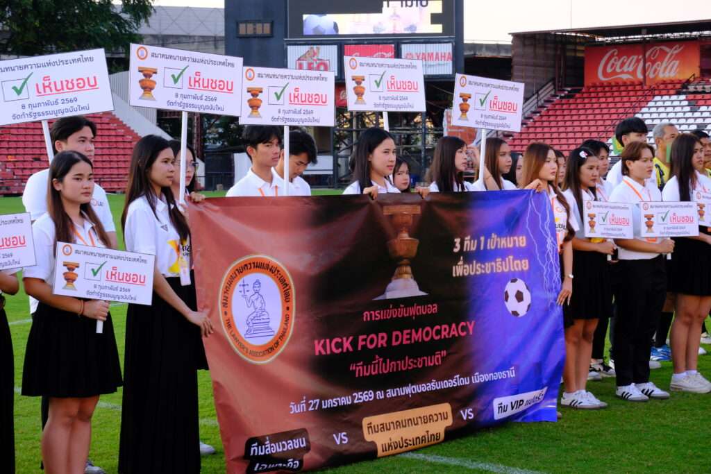 สนามฟุตบอล ธันเดอร์โดม สเตเดียม เมืองทองธานี – นายจาตุรนต์ ฉายแสง ประธานคณะกรรมการรณรงค์สื่อสารประชามติและรัฐธรรมนูญฉบับประชาชน พรรคเพื่อไทย และหัวหน้าทีมฟุตบอล VIP แปดริ้ว พร้อมกับผู้สมัคร สส.และสมาชิกพรรคเพื่อไทย อาทิ ดร.วิโชติ วัณโณ, ดร.จำนงค์ ไชยมงคล และนายภัทรพล ฐิติภวัตสกุล เข้าร่วมกิจกรรมเตะฟุตบอลกระชับมิตร “Kick for Democracy: 3 ทีม 1 เป้าหมาย เดินหน้าสู่รัฐธรรมนูญฉบับใหม่” เพื่อรณรงค์ให้ประชาชน “เห็นชอบ” การจัดทำรัฐธรรมนูญฉบับใหม่ โดยมีกลุ่มเยาวชน นิสิต นักศึกษา ที่สนใจร่วมให้กำลังใจ พร้อมเปล่งเสียง “8 กุมภา กาเห็นชอบ” ด้านข้างขอบสนาม