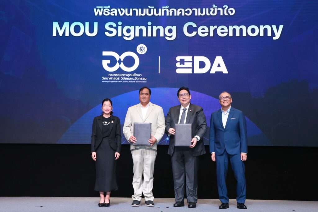 หนึ่งในไฮไลต์สำคัญของงาน คือพิธีลงนามบันทึกความเข้าใจ (MOU) เพื่อขับเคลื่อนความร่วมมือด้าน AI Transformation เพื่อการเรียนรู้และเส้นทางอาชีพของคนไทย ระหว่างภาครัฐและภาคเอกชน โดยมีผู้แทนร่วมลงนาม ได้แก่ ดร.พันธุ์เพิ่มศักดิ์ อารุณี รองปลัด อว. และนายเทพฤทธิ์ สีน้ำเงิน กรรมการผู้จัดการ บริษัท อีดีเอ (ประเทศไทย)