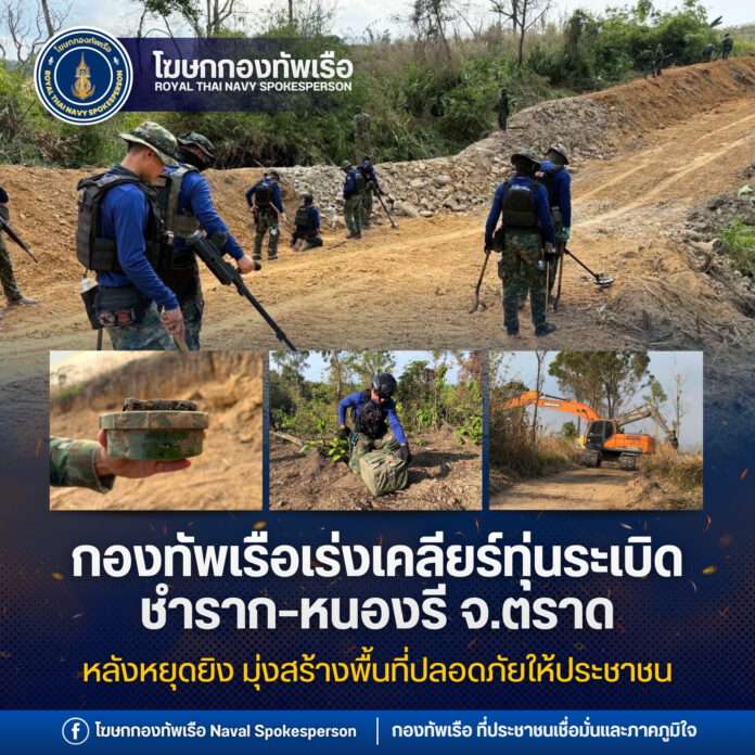 หน้าแรกกองทัพ-ความมั่นคงกองทัพเรือ เดินหน้าเก็บกู้วัตถุระเบิดพื้นที่ชำราก–หนองรี จ.ตราด เพิ่มความปลอดภัยประชาชนอย่างต่อเนื่องภายหลังข้อตกลงหยุดยิง