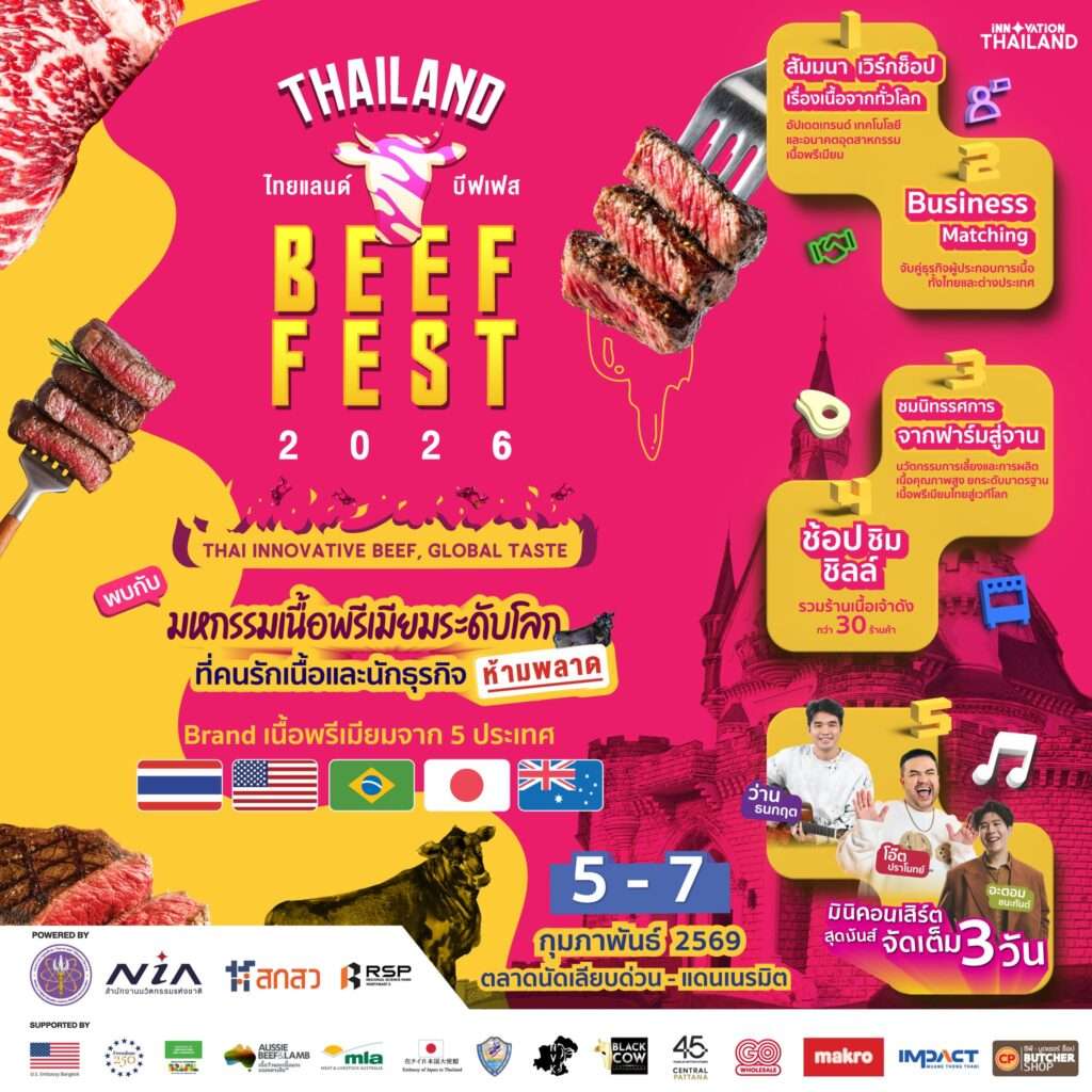 การเดินทางของเนื้อไทยไม่ได้จบแค่ที่หน้าฟาร์ม แต่ NIA และพันธมิตรมองไกลถึง “ปลายน้ำ” นั่นคือการสร้างระบบนิเวศการตลาดของเนื้อไทยในงาน “Thailand Beef Fest” เพื่อสร้างเวทีระดับประเทศให้เนื้อไทยพรีเมียมได้โชว์ตัวจริง เทียบชั้นกับเนื้อระดับโลกจากสหรัฐ ญี่ปุ่น บราซิล และออสเตรเลียที่เข้าร่วมงานด้วย งานนี้จะเปลี่ยนจากงานแสดงสินค้าธรรมดาสู่การเป็น “แพลตฟอร์มเศรษฐกิจเนื้อ” ที่เชื่อมผู้เลี้ยง ผู้แปรรูป เชฟ ร้านอาหาร ผู้จัดจำหน่าย นักลงทุน และคนรักเนื้อเข้าไว้ในระบบเดียวกัน หากคุณเป็นหนึ่งใน Beef Lover ที่อยากสัมผัสกับอนาคตของเนื้อไทยพรีเมียมด้วยตัวเอง อยากลิ้มลองเนื้อทั้ง 4 แบรนด์ และอยากเข้าใจว่านวัตกรรมสามารถเปลี่ยนเนื้อท้องถิ่นให้กลายเป็นเนื้อระดับโลกได้อย่างไร งาน “Thailand Beef Fest 2026” คือคำตอบ