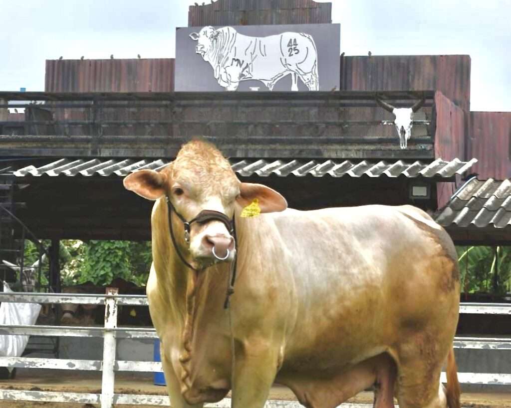 เริ่มกันที่ “โคดำลำตะคอง” จาก จ.นครราชสีมา ดินแดนที่เปรียบเสมือนประตูสู่อีสาน ณ ความสูง 300 เมตร เหนืระดับน้ำทะเลของ อ.สีคิ้ว คือที่ตั้งของแหล่งผลิตเนื้อคุณภาพที่ผสานวิทยาศาสตร์เข้ากับธรรมชาติอย่างลงตัว ความพิเศษของที่นี่คือการใช้นวัตกรรม การปรับปรุงพันธุ์ขั้นสูงแบบ “Triple Cross Breed” หรือการผสมข้าม 3 สายพันธุ์ เพื่อดึงจุดเด่นที่ดีที่สุดมารวมกัน ได้แก่ สายพันธุ์วากิว ที่ให้ลายไขมันแทรกสวยงาม สายพันธุ์แองกัส ที่ให้โครงสร้างเนื้อที่สมบูรณ์และรสเนื้อเข้มข้น และสายพันธุ์โคพื้นเมือง ที่มีความทนทานต่อสภาพอากาศเมืองไทย ผสานกับการจัดการอาหารโดยใช้วัตถุดิบจากภาคเกษตรในพื้นที่ มาคำนวณโภชนาการอย่างแม่นยำ เมื่อมองด้วยตาเปล่า เนื้อชนิดนี้จะมีสีแดงสดตัดกับไขมันแทรกที่กระจายตัวเป็นเส้นฝอยๆ อย่างสม่ำเสมอ ไม่หนาทึบจนขาวโพลน แต่เป็นลายหินอ่อนที่ดูสวยงาม รสสัมผัสที่ได้คือความสมดุลที่สามารถตอบโจทย์ของคนรักเนื้อได้อย่างตรงจุด คือ “นุ่มแต่ไม่เลี่ยน” วินาทีแรกที่เคี้ยว จะได้สัมผัสความนุ่มหยุ่นสู้ฟันจากพันธุกรรมแองกัส ตามมาด้วยความฉ่ำของไขมันวากิว ที่ละลายออกมาเคลือบลิ้น เป็นรสชาติที่กลมกล่อม เคี้ยวเพลินได้เรื่อยๆ นอกจากนี้ ยังมีการใช้นวัตกรรม Food Waste Management แปรรูปเนื้อส่วนเกินเป็นผลิตภัณฑ์มูลค่าสูง เป็นแกงพะแนงเนื้อพร้อมทานที่รสชาติดีจนสามารถส่งออกไปสร้างชื่อเสียงไกลถึงต่างแดนได้