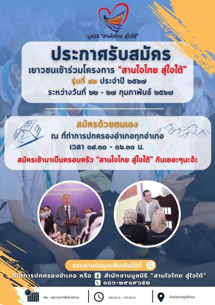 จังหวัดชายแดนใต้, วันที่ 30 ม.ค. – มูลนิธิ “สานใจไทย สู่ใจใต้ ร่วมกับ ศูนย์อำนวยการบริหารจังหวัดชายแดนภาคใต้ กรมการปกครอง กระทรวงมหาดไทย และสมาคมเยาวชนสานใจไทย สู่ใจใต้ เปิดรับสมัครเยาวชนโครงการ สานใจไทย สู่ใจใต้ รุ่นที่ 46 ระหว่าง วันที่ 20-23 กุมภาพันธ์ 2569 ณ ที่ว่าการอำเภอที่มีภูมิลำเนาอยู่ (โดยไม่เสียค่าธรรมเนียมในการสมัคร) ในพื้นที่ 5 จังหวัดชายแดนภาคใต้ ได้แก่ จังหวัดปัตตานี ยะลา นราธิวาส สตูล และสงขลา (อำเภอจะนะ เทพา นาทวี และสะบ้าย้อย) ตั้งแต่เวลา 08.30 – 16.30 น.