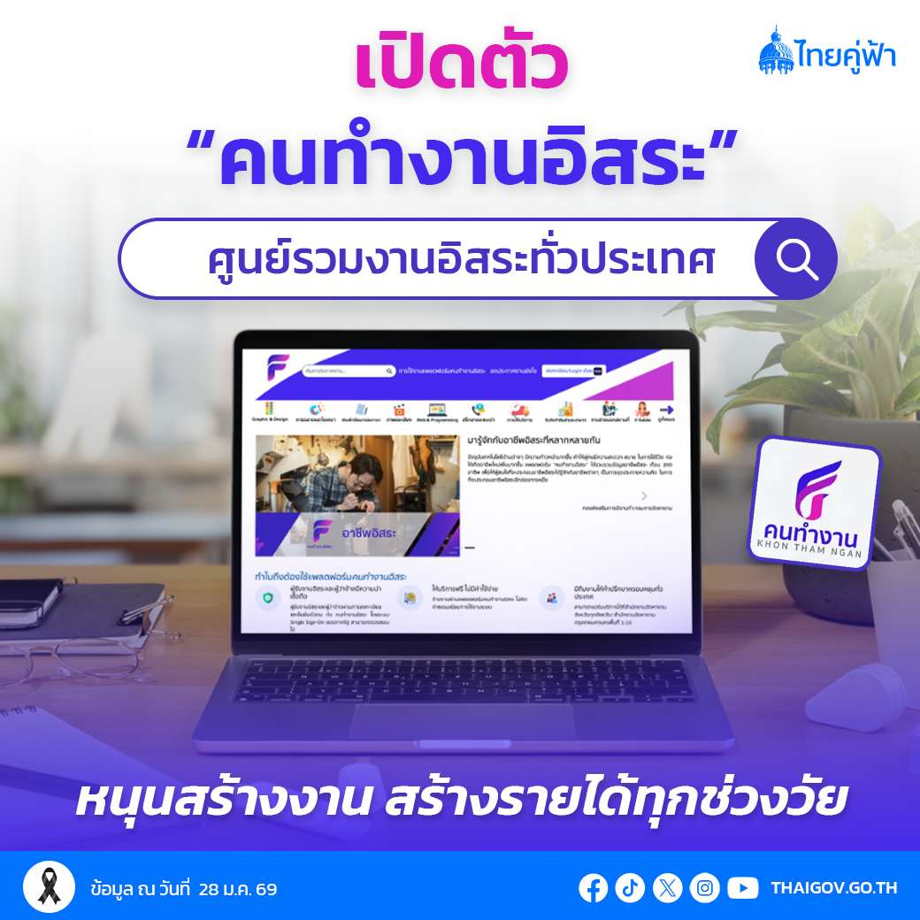 กรุงเทพฯ, วันที่ 30 ม.ค. – กรมการจัดหางาน พัฒนาแพลตฟอร์ม “คนทำงานอิสระ” ศูนย์รวมงานและบริการอาชีพอิสระในรูปแบบออนไลน์ที่ทันสมัย ใช้งานง่าย และครบวงจร รองรับทั้งผู้ว่าจ้าง ผู้ประกอบอาชีพอิสระ พนักงานประจำที่หารายได้เสริม และผู้ว่างงานที่มีทักษะความสามารถ เพื่อส่งเสริมให้ประชาชนทุกช่วงวัยมีอาชีพ มีงานทำ และมีรายได้อย่างทั่วถึง
