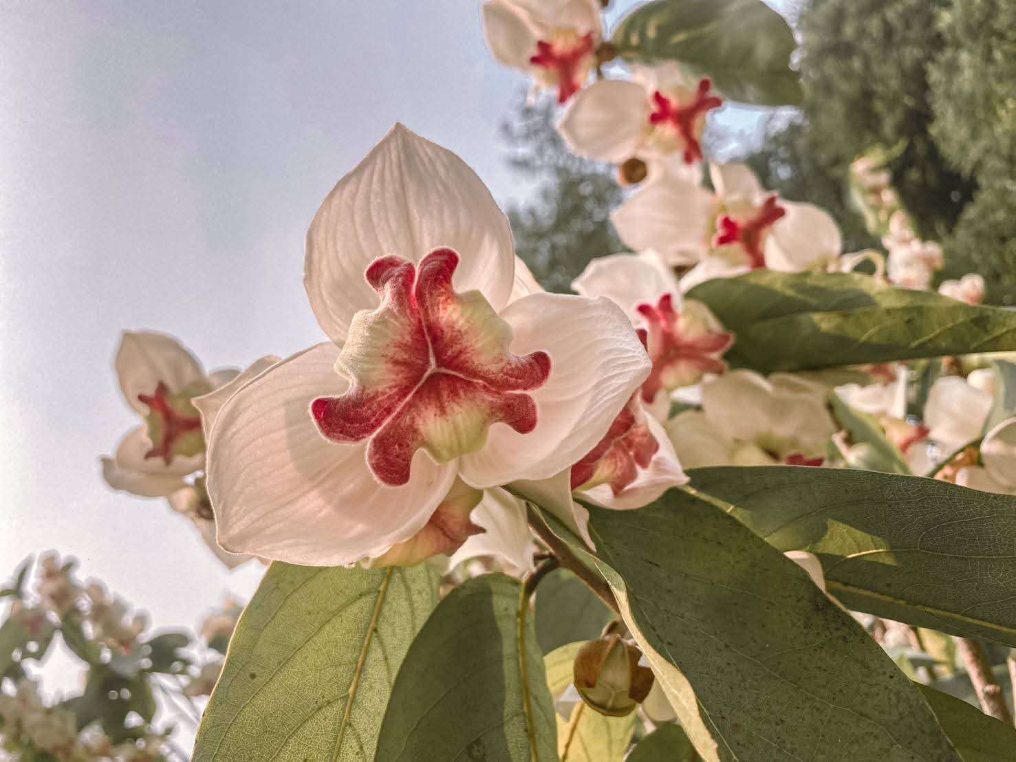 กลีบดอกวงนอกสีขาวบริสุทธิ์ รูปไข่กว้าง ยาว 4–5.5 เซนติเมตร ขณะที่กลีบดอกวงในมีสีชมพูอมม่วงนวลละมุน สั้นกว่าวงนอกเล็กน้อย โคนกลีบมีลักษณะคล้ายเงี่ยงลูกศร ทุกส่วนปกคลุมด้วยขนสีน้ำตาลแดงหนาแน่น เมื่อดอกบานเต็มที่ ความงามนั้นชวนให้จินตนาการราวกับพรหมจากสวรรค์เสด็จลงมาประทับบนโลกมนุษย์