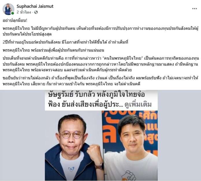 วันที่ 2 กุมภาพันธ์ 2569 นายศุภชัย ใจสมุทร ผู้สมัครสส.บัญชีรายชื่อ และประธานคณะทำงานด้านกฎหมายพรรคภูมิใจไทย โพสต์เฟซบุ๊ก กรณีนายษัษฐรัมย์ ธรรมบุษดี อาจารย์ประจำวิทยาลัยสหวิทยาการ มหาวิทยาลัยธรรมศาสตร์ ในฐานะกรรมการประกันสังคม ในสัดส่วนผู้ประกันตน ออกมายอมว่ากลัวภูมิใจไทยฟ้อง