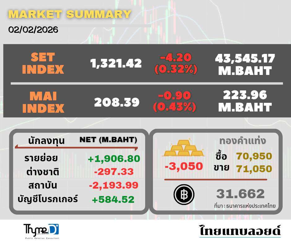SET ปิดวันนี้ที่ 1,321.42 จุด ลดลง 4.20 จุด (-0.32%) มูลค่าซื้อขาย 43,545.17 ล้านบาท