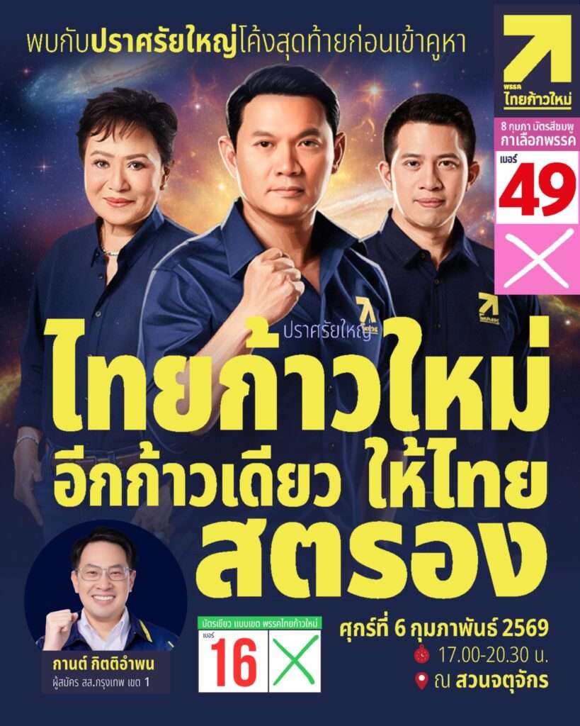 ทั้งนี้ พรรคไทยก้าวใหม่มีกำหนดการปราศรัยใหญ่ ภายใต้คอนเซปต์ “ไทยก้าวใหม่ อีกก้าวเดียว ให้ไทยสตรอง” วันที่ 6 กุมภาพันธ์ ตั้งแต่เวลา 17.00น.เป็นต้นไป ณ ลานสวนจตุจักร