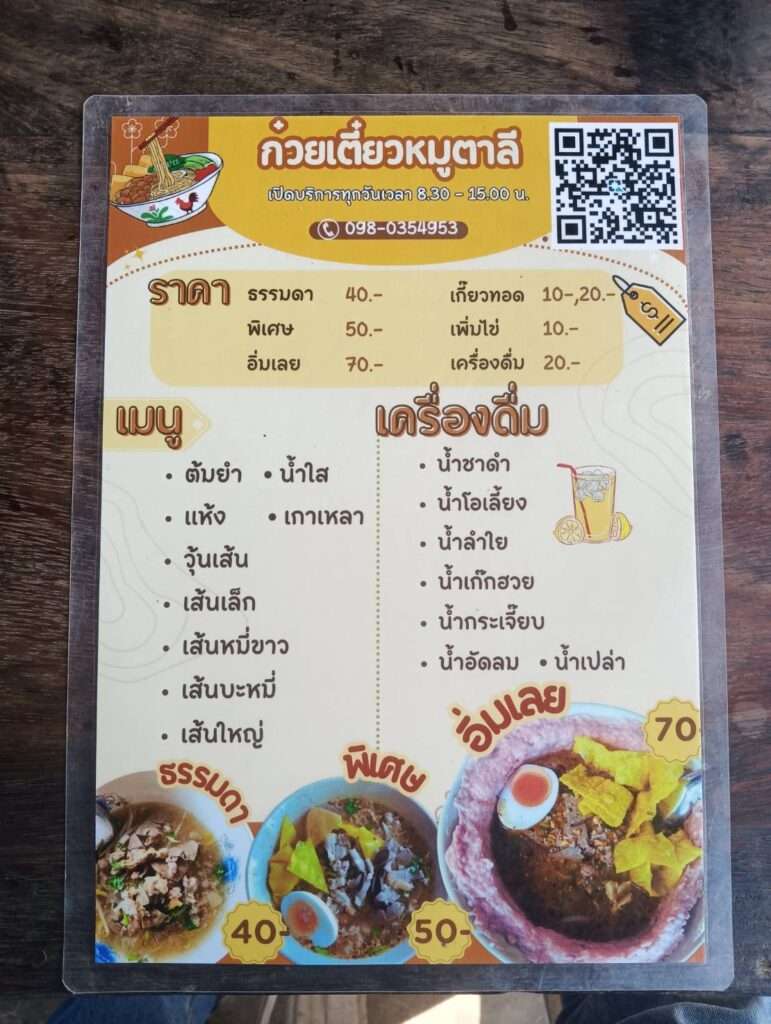 แต่ถ้าใจอยากจะกินก็ไม่ใช่เรื่องยาก ดั้นด้น ค้นหา จนมาเจอร้าน”ก๋วยเตี๋ยวหมูตาลี”ก๋วยเตี๋ยวหมูโบราณรสดีแห่งเมืองสุพรรณ ที่ยังคงเอกลักษณ์ ขอความเป็นก๋วยเตี๋ยวหมูโบราณ แบบครบเครื่อง ครบรส เพิ่มเติมคือการผสมผสานแนวคิดใหม่ โดยเอาหมูเด้งมาแผ่รองรอบชาม แล้วใส่ก๋วยเตี๋ยวหมูโบราณ จะแห้ง จะน้ำ จะต้มยำ หรือน้ำใส แล้วเพิ่มไข่ ก็ไฉไล น่ากิน