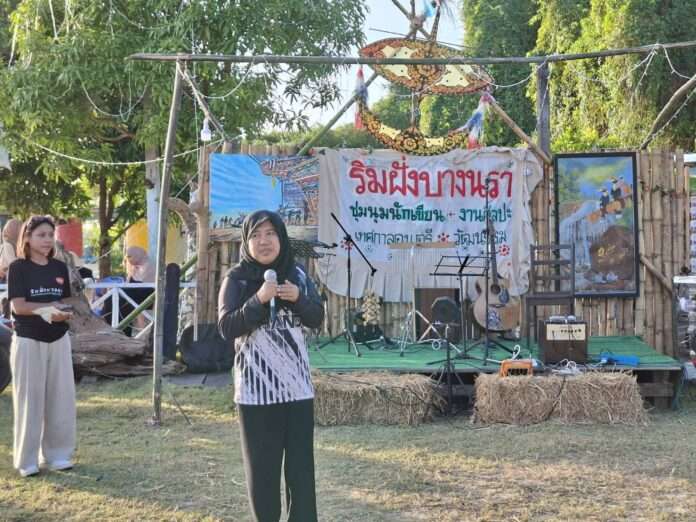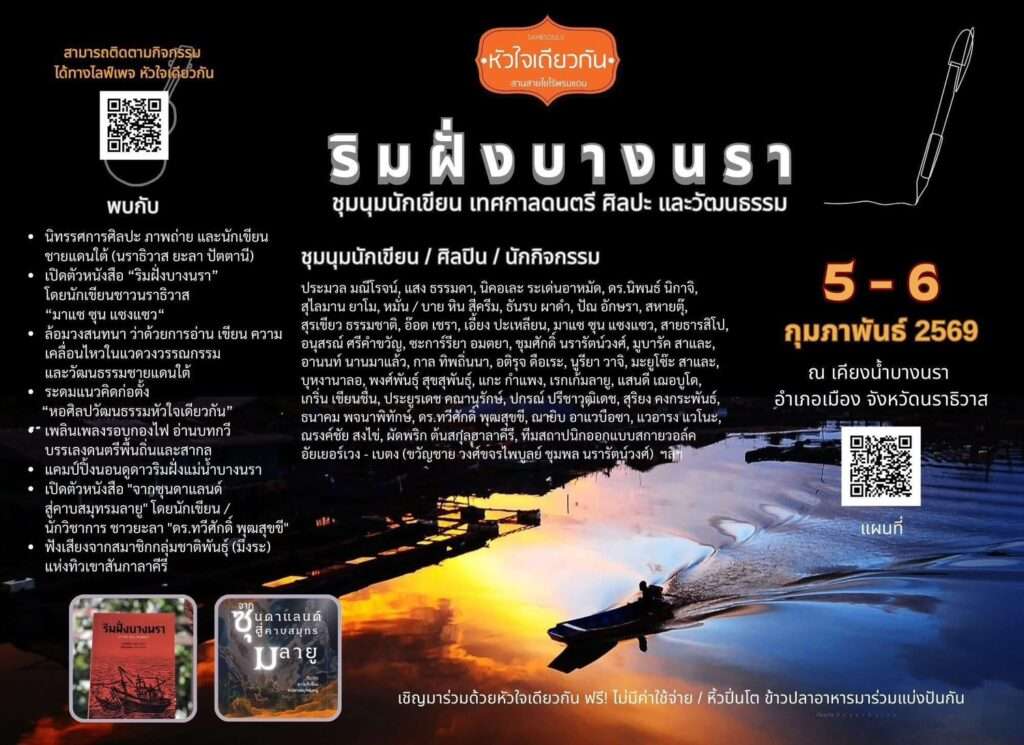 นราธิวาส, วันที่ 5 ก.พ. – ประชาคมนักเขียนและศิลปินหลากหลายสาขากว่า 200 คน จากเครือข่าย ‘หัวใจเดียวกัน’ Yiwa Yang Sama ซึ่งเป็นศิลปินจากบ้านเกิดใน3 จังหวัดชานแดนใต้ หลากหลายรุ่น ทั้งบังเช ซาการียา แบนาจิบ กวีซีไรต์ปี 2553 และครูเทียน ทัดดาว เป็นต้น ได้มาชุมนุมกันเป็นครั้งแรกในงาน “ริ ม ฝั่ ง บ า ง น ร า” ซึ่งจัดขึ้นระหว่าง วันที่ 5 – 6 กุมภาพันธ์ 2569 ณ เคียงน้ำบางนรา ต.กะลุวอเหนือ อ.เมือง จ.นราธิวาส ซึ่งนักเขียนในพื้นที่ที่ทำงานมานาน 2 ทศวรรษ ได้อาสารวมคน-จัดการ โดยกิจกรรมเริ่มตั้งแต่ช่วงบ่าย โดยมีนางสาวอาซีซ๊ะ สะมะแอ ผู้อำนวยการกลุ่มส่งเสริมศาสนา ศิลปะและวัฒนธรรม สำนักงานวัฒนธรรมจังหวัดนราธิวาส ปฏิบัติหน้าที่รักษาราชการแทนวัฒนธรรมจังหวัด และ คุณละม้าย มานะการ ร่วมเปิดงาน