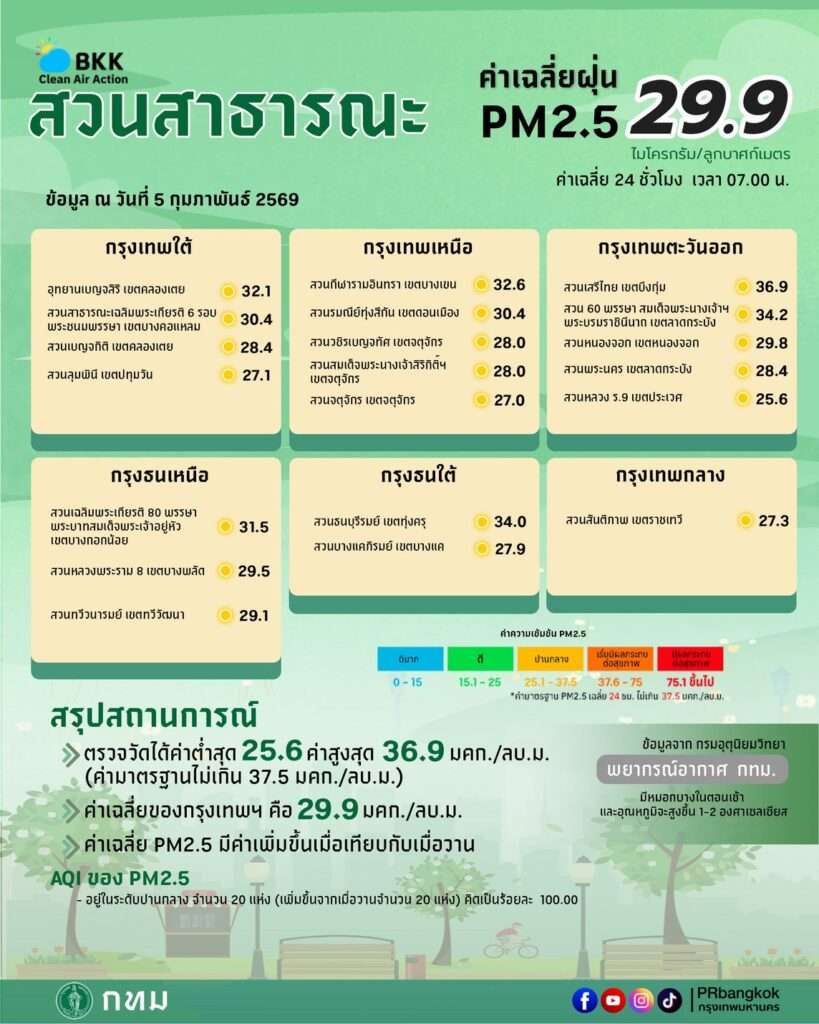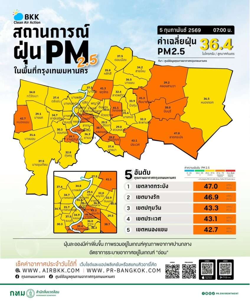 ศูนย์ข้อมูลคุณภาพอากาศกรุงเทพมหานคร รายงานสถานการณ์ฝุ่นละอองขนาดไม่เกิน 2.5 ไมครอน (PM2.5) ประจำวันที่ 5 กุมภาพันธ์ 2569 เวลา 07.00 น. พบว่า ค่าเฉลี่ยของกรุงเทพมหานครอยู่ที่ 36.4 ไมโครกรัมต่อลูกบาศก์เมตร ใกล้ค่ามาตรฐานที่กำหนดไม่เกิน 37.5 มคก./ลบ.ม. โดยภาพรวมคุณภาพอากาศอยู่ในระดับ ปานกลาง และมีแนวโน้มเพิ่มขึ้น