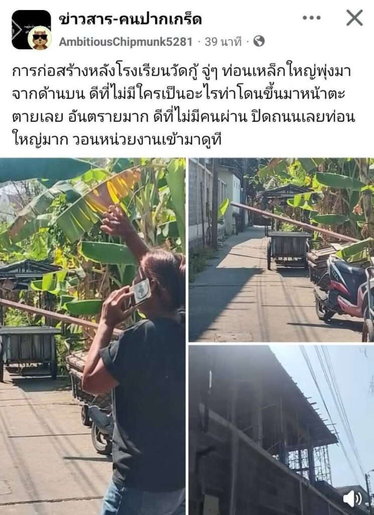 เมื่อวันที่ 4 กุมภาพันธ์ 2569 ผู้สื่อข่าวลงพื้นที่ตรวจสอบบริเวณซอยหลังโรงเรียนวัดกู้ พบ น.ส.ปราณีต แวววงษ์ทอง อายุ 56 ปี กรรมการหมู่บ้านวัดกู้ ให้ข้อมูลว่า เหตุเกิดเมื่อวันที่ 2 กุมภาพันธ์ที่ผ่านมา เวลาประมาณ 12.00 น. ระหว่างที่มีการก่อสร้างอาคารดับเพลิงซึ่งตั้งติดกับบ้านของตน ได้เกิดเหตุท่อนเหล็กสำหรับเทปูน ความยาวประมาณ 10 เมตร ร่วงลงมาจากด้านบน ตกเฉียดจุดที่ตนนั่งอยู่ ก่อนเสียบเข้ากับต้นกล้วยข้างบ้าน หากโดนคนอาจถึงขั้นเสียชีวิต
