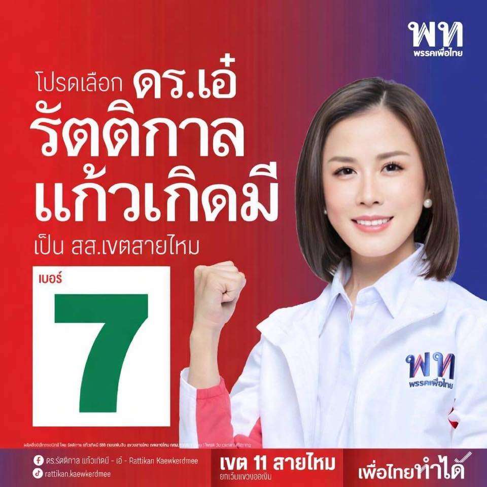 “เอ๋จึงขอประกาศไว้ ณ ที่นี้ว่าพรรคเพื่อไทย ไม่สนับสนุน และขอปฏิเสธการซื้อสิทธิ์ขายเสียงทุกรูปแบบใครที่ใช้วิธีการใต้ดินแบบนี้เลิกทำซะ แล้วมาแข่งกันด้วยนโยบายและการทำงานให้พี่น้องประชาชนดีกว่า ถ้ามีหลักฐาน… เชิญค่ะ” น.ส.รัตติกาลกล่าว