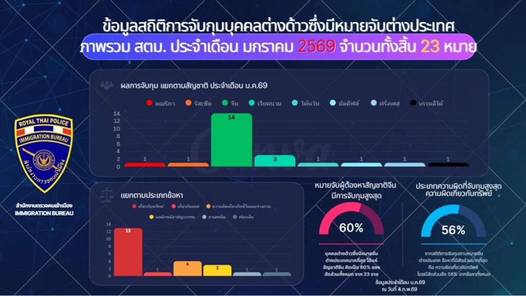 เปิดสถิติคุมเข้มต่างชาติหมายจับ สำนักงานตรวจคนเข้าเมืองเปิดเผยสถิติการจับกุมคนต่างด้าวที่มีหมายจับจากต่างประเทศ ปี 2568 จับกุมได้ 102 ราย ส่วนใหญ่เป็นคดีเกี่ยวกับทรัพย์ ยาเสพติด และอาชญากรรมร้ายแรง โดยผู้ต้องหาสัญชาติจีนมากที่สุด ปี 2569 (ถึงปัจจุบัน) จับกุมแล้ว 23 ราย เพิ่มขึ้นในคดีองค์กรอาชญากรรม ฟอกเงิน และความผิดร้ายแรงต่อชีวิตและร่างกาย