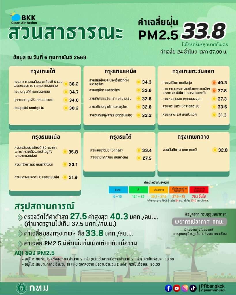 ศูนย์ข้อมูลคุณภาพอากาศกรุงเทพมหานคร รายงานสถานการณ์ฝุ่นละอองขนาดไม่เกิน 2.5 ไมครอน (PM2.5) ประจำวันที่ 6 กุมภาพันธ์ 2569 เวลา 07.00 น. พบว่า ค่าเฉลี่ยของกรุงเทพมหานครอยู่ที่ 41.1 ไมโครกรัมต่อลูกบาศก์เมตร สูงกว่าค่ามาตรฐานที่กำหนดไม่เกิน 37.5 ไมโครกรัมต่อลูกบาศก์เมตร ส่งผลให้คุณภาพอากาศโดยรวมอยู่ในเกณฑ์ “เริ่มมีผลกระทบต่อสุขภาพ” ระดับสีส้ม