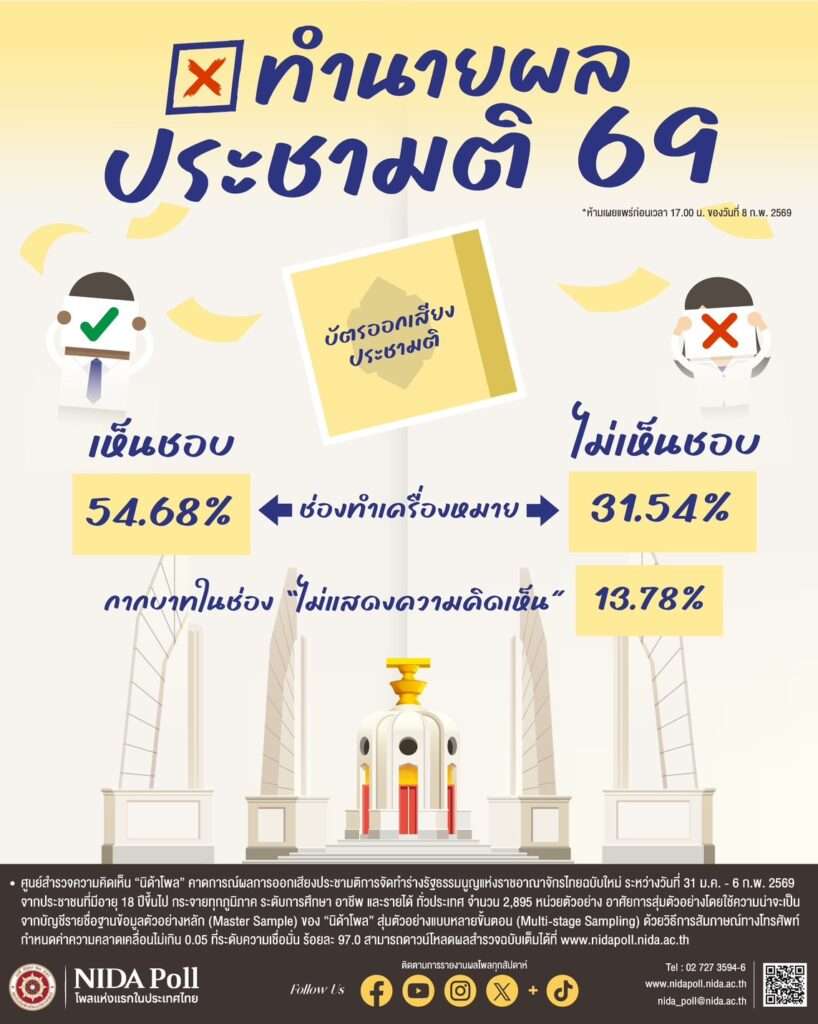 วันนี้ (8 กุมภาพันธ์) ศูนย์สำรวจความคิดเห็น นิด้าโพล สถาบันบัณฑิตพัฒนบริหารศาสตร์ (นิด้า) คาดการณ์ผลการเลือกตั้งสมาชิกสภาผู้แทนราษฎร (สส.) 2569 ประกอบด้วยวิธีการ คือ 1. เก็บข้อมูลด้วยวิธีการสัมภาษณ์ทางโทรศัพท์ ระหว่างวันที่ 31 มกราคม – 6 กุมภาพันธ์ 2569 รวมจำนวนทั้งสิ้น 3,000 หน่วยตัวอย่าง และการวิเคราะห์ความเป็นไปได้ทางการเมือง เพื่อคาดการณ์จำนวน (สส.) รวมแบบแบ่งเขตเลือกตั้งและแบบบัญชีรายชื่อของแต่ละพรรคการเมือง ผลการวิเคราะห์ค้นพบ ดังนี้