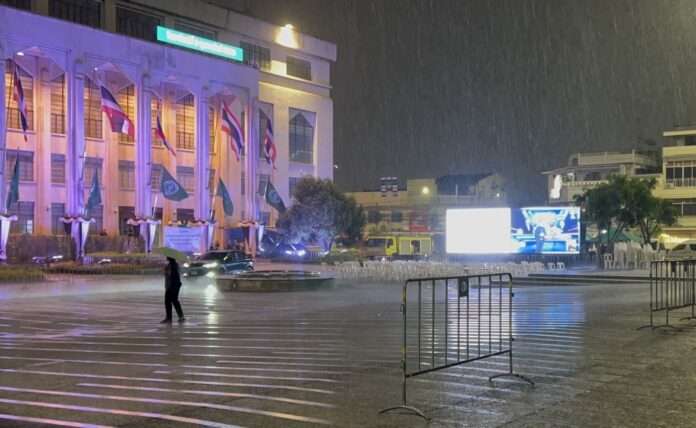 กรุงเทพมหานคร มีฝนตกลงมาอย่างหนักเขตพื้นที่บางกะปิ ลานคนเมืองฝนถล่มแต่ประชาชนไม่ท้อยังดูการนับคะแนนอย่างต่อเนื่อง