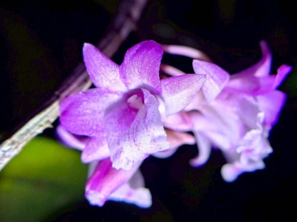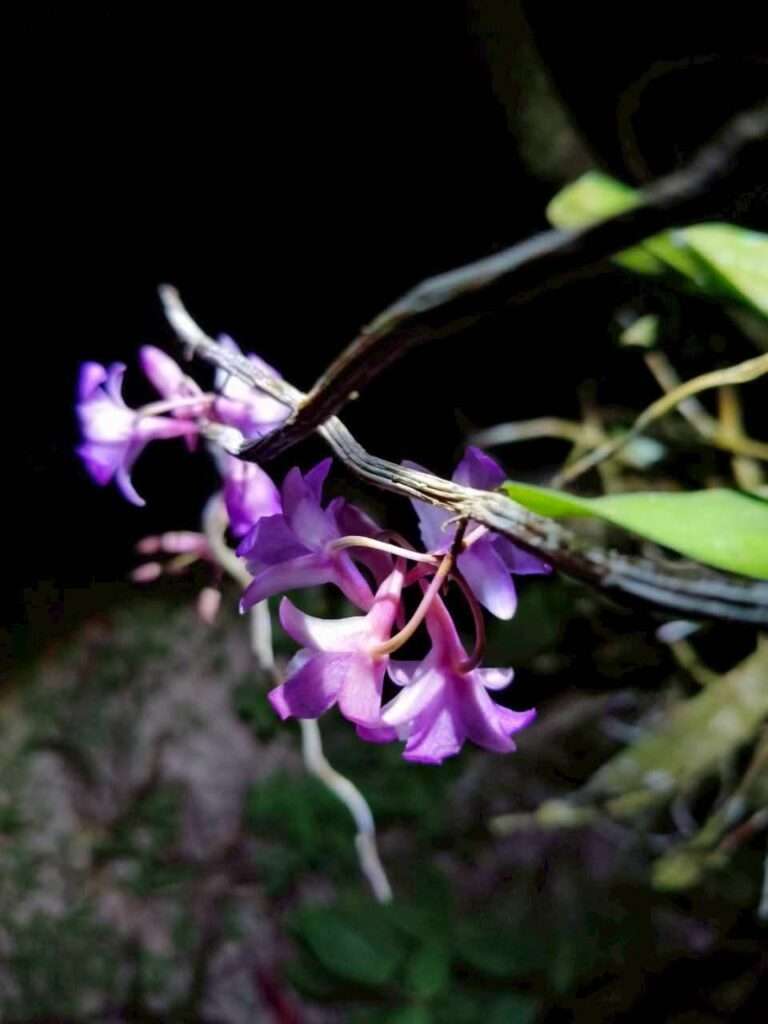 เมื่อถึงฤดูออกดอก ความงามของเอื้องสายปากครุยจะเผยตัวออกมาอย่างพอดี ไม่มาก ไม่น้อย ช่อดอกสั้นๆ แทงออกจากลำต้นที่ไร้ใบ หนึ่งช่อมีเพียง 4–6 ดอก แต่กลับดึงสายตาด้วยโทนสีม่วงขาวที่ตัดกับสีเขียวของป่า ก้านช่อดอกและแกนกลางมีสีม่วงคล้ำ ขับให้กลีบเลี้ยงสีขาวแต้มม่วงดูโดดเด่น ปลายกลีบบากตื้นราวกับตั้งใจเว้นจังหวะให้ผู้ชมได้หยุดมอง