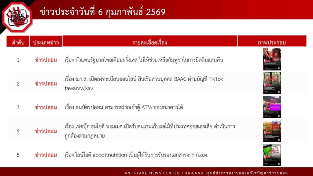 กรุงเทพฯ, วันที่ 8 ก.พ. – นายเวทางค์ พ่วงทรัพย์ ในฐานะโฆษกกระทรวงดิจิทัลเพื่อเศรษฐกิจและสังคม (ดีอี) กล่าวถึงผลการมอนิเตอร์และรับแจ้งข่าวปลอมของศูนย์ต่อต้านข่าวปลอมประเทศไทย (AFNC) ว่า ในวันที่ 6 กุมภาพันธ์ AFNC ได้ตรวจสอบพบข้อความทั้งหมด 162,566 ข้อความ โดยมีข้อความที่ต้องดำเนินการตรวจสอบ (Verify) ทั้งสิ้น 4,668 ข้อความ สำหรับช่องทางที่มีการพบเบาะแสมากที่สุด คือ ข้อความที่มาจาก Social Listening 4,668 ข้อความ โดยเป็นเรื่องที่ต้องดำเนินการตรวจสอบทั้งหมด 35 เรื่อง ได้รับผลการตรวจสอบจากหน่วยงานที่เกี่ยวข้องแล้ว 4 เรื่อง ในจำนวนนี้เป็นข่าวที่ได้รับความสนใจจากประชาชนมากที่สุด 9 เรื่อง ซึ่งเป็นข่าวปลอม 7 เรื่อง ได้แก่