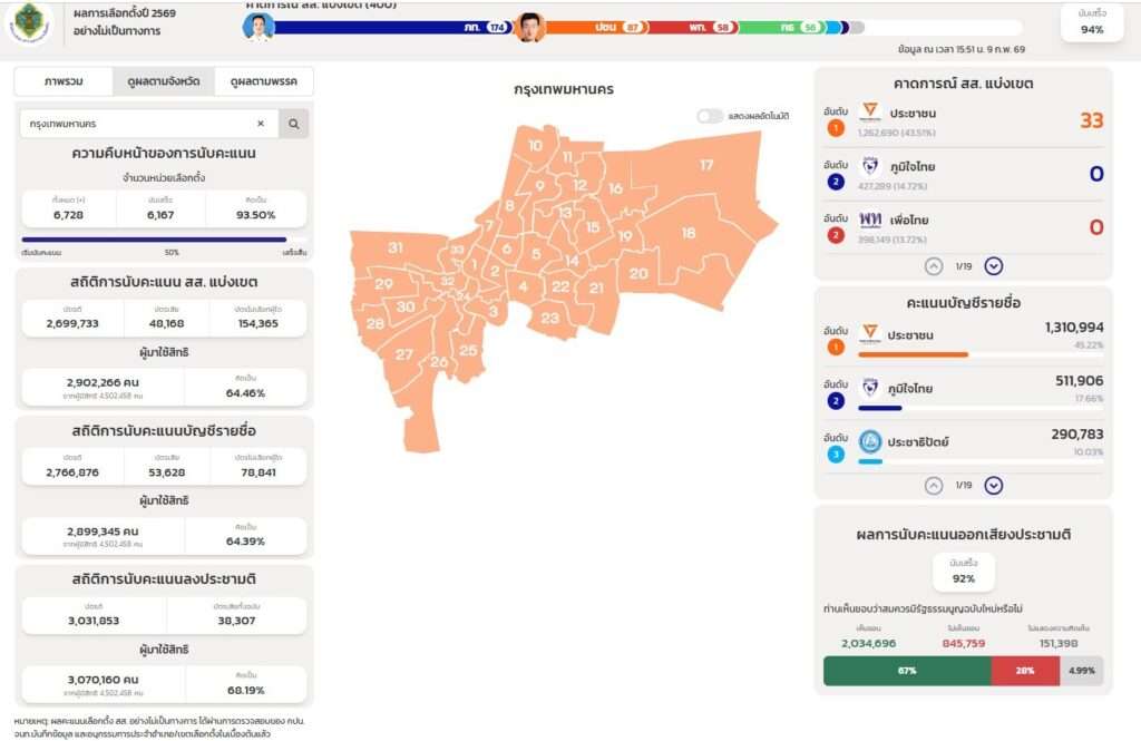 กทม. เผยคะแนนเลือกตั้ง สส. –ประชามติ คืบหน้าเกิน 93% ชาวกรุงใช้สิทธิกว่า 64 % ภาพรวมเรียบร้อย