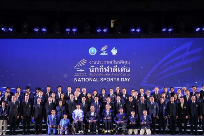 กรุงเทพฯ, วันที่ 9 กุมภาพันธ์ – ร.อ.ธรรมนัส พรหมเผ่า รองนายกรัฐมนตรี เป็นประธานในพิธีประกาศเกียรติคุณนักกีฬาดีเด่น เนื่องในวันกีฬาแห่งชาติ ประจำปี พ.ศ. 2568 ณ อินดอร์สเตเดี้ยม หัวหมาก การกีฬาแห่งประเทศไทย โดยมี นายอรรถกร ศิริลัทธยากร รัฐมนตรีว่าการกระทรวงการท่องเที่ยวและกีฬา, นางสาววนิดา พันธ์สอาด รองปลัดกระทรวงการท่องเที่ยวและกีฬา, ดร.ก้องศักด ยอดมณี ผู้ว่าการการกีฬาแห่งประเทศไทย (กกท.) พร้อมด้วยผู้บริหาร บุคลากรทางการกีฬา และนักกีฬา เข้าร่วม