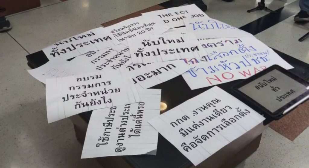 ต่อมากลุ่มนักศึกษาและภาคประชาชน เดินทางมายังหน้าสำนักงานคณะกรรมการการเลือกตั้ง เพื่อเรียกร้องความเป็นธรรมในการนับคะแนนเลือกตั้ง โดย ได้เดินทางมายังพื้นที่การแถลงข่าวของสำนักงานคณะกรรมการการเลือกตั้ง แต่กลับถูกเจ้าหน้าที่ตำรวจเชิญออกจากห้องแถลงข่าว ของ กกต. เนื่องจากพื้นที่ดังกล่าวอนุญาตให้เฉพาะเจ้าหน้าที่และสื่อมวลชนเท่านั้น
