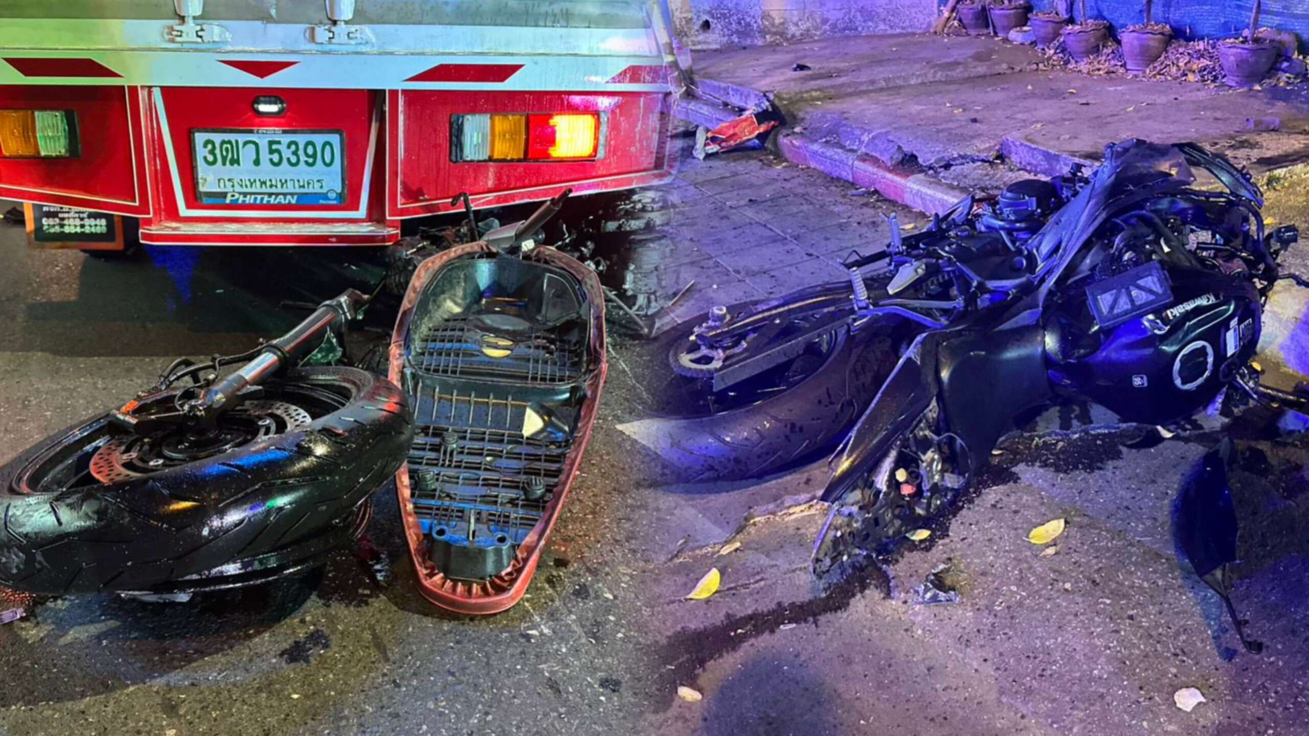 ที่เกิดเหตุเป็นถนน 3 เลน บริเวณฟุตปาธมีต้นไม้หักขาด 1 ต้น ใกล้กันพบรถบิ๊กไบก์ ยี่ยี่ห้อคาวาซากิ นินจา650cc สีดำ ไม่ติดแผ่นป้ายทะเบียน สภาพล้มคว่ำพังยับ ล้อและโช๊คอัพคู่หน้าขาดหลุดกระเด็น ห่างไปประมาณ 3 เมตรบริเวณช่องจราจรซ้ายสุด พบรถจักรยานยนต์ ยี่ห้อฮอนด้า เวฟ สีดำ สภาพล้มคว่ำพังเสียหาย อยู่ใต้ท้ายรถกระบะตู้ทึบ ยี่ห้อโตโยต้า สีขาว ทะเบียนกรุงเทพ ใกล้กันพบรถยนต์ ยี่ห้อวอลโว่ สีเทา ทะเบียนกรุงเทพ สภาพไฟท้ายด้านซ้ายแตกเสียหาย จึงบันทึกรวบรวมที่เกิดเหตุไว้เป็นหลักฐาน