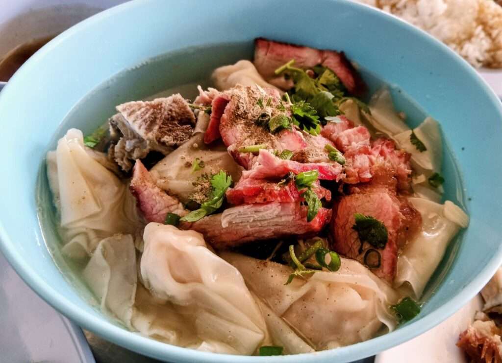 อีกหนึ่งรายการที่ห้ามพลาด คือ..เกี๊ยวน้ำ…เกี๊ยวตัวใหญ่ ใส่กระดูกเล้งและหมูแดง ราดน้ำซุปใสๆในสไตลของ”แกงจืดเมืองตรัง” ที่ใช้ขิงเป็นตัวชูรส ซดชื่นใจ หอมกลิ่นขิงชัดเจน เกี๊ยวน้ำชามนี้ราคา 50 บาท