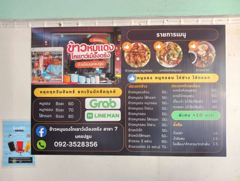 รายการอาหารที่ร้านโกเยาว์ นอกจาก ข้าวหมูแดง หมูกรอบแล้ว ยังมีข้าวหน้าไก่(หมด)และข้าวหน้าไส้กรอก(หมด) รวมถึงบะหมี่เกี๊ยวไว้คอยบริการอีกด้วย