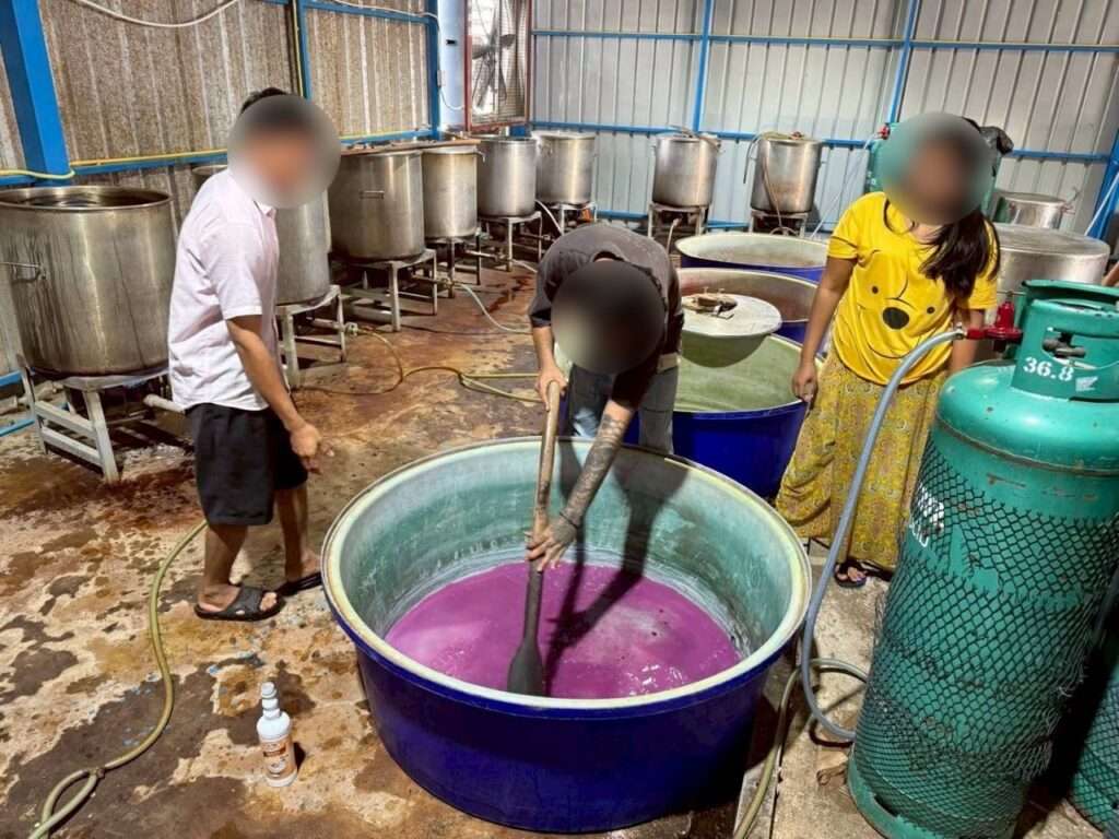 จุดที่ 2 เป็นโกดังผลิตเครื่องดื่ม “78 (Seven-eight)”พบ น.ส.เทียน อายุ 19 ปี สัญชาติเมียนมา กำลังต้มใบกระท่อมในหม้อ ก่อนผสมน้ำเชื่อมรสต่าง ๆ ใช้แรงงานต่างด้าวกรอกใส่ขวดโดยไม่สวมถุงมือตรวจยึดน้ำหวานสีต่าง ๆ กว่า 16 สี ของเหลวบรรจุแกลลอน 20 ลิตร และอุปกรณ์การผลิตจำนวนมาก ซึ่งสถานที่ก็ไม่ได้รับอนุญาตและไม่ถูกสุขลักษณะด้วย