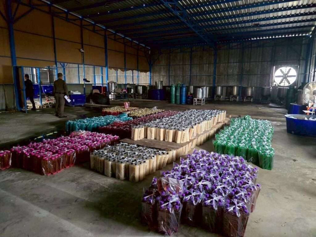 จุดที่ 4 แหล่งผลิตน้ำหวานไม่ติดฉลาก พบนายจุมพล อายุ 34 ปี นำตรวจค้น ยึดน้ำหวานไม่ติดฉลาก ฝาสีส้ม-เขียวนับร้อยขวด พร้อมอุปกรณ์การผลิตจำนวนมาก