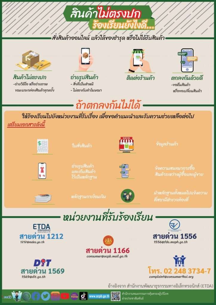 ขณะเดียวกัน กรณีในการโอนเงินและรับพัสดุมาแล้ว ขณะเปิดพัสดุ แนะนำให้ถ่ายคลิปวิดีโอไว้ทุกครั้ง เพื่อยืนยันสภาพสินค้าภายในว่าใช่ของท่านหรือไม่ สินค้าถูกต้องครบถ้วนหรือไม่ หากพบว่าสินค้าไม่ตรงปกหรือไม่ได้สั่งจริง สามารถติดต่อขอคืนเงินจากผู้ขายได้ทันที และหากไม่สามารถตกลงกันได้ ให้รวบรวมหลักฐาน ได้แก่ ใบสั่งซื้อ ภาพถ่ายสินค้าและบรรจุภัณฑ์ หลักฐานการโอนเงิน ข้อมูลร้านค้า และข้อความสนทนาระหว่างผู้ซื้อกับผู้ขาย เข้าแจ้งความที่สถานีตำรวจใกล้บ้าน หรือร้องเรียนขอคำแนะนำและความช่วยเหลือได้ที่ สายด่วน 1212, สายด่วน 1166, สายด่วน 1556, สายด่วน 1569 และหมายเลขโทรศัพท์ 02-248-3734-7 เพื่อป้องกันและลดความเสี่ยงจากกการถูกหลอกลวงทางออนไลน์ด้วย