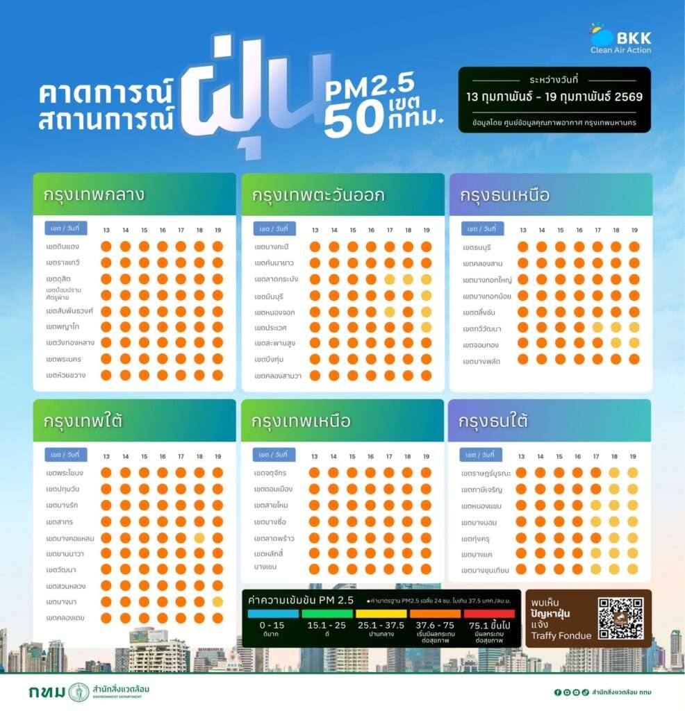 ศูนย์ข้อมูลคุณภาพอากาศกรุงเทพมหานคร รายงานสถานการณ์ฝุ่นละอองขนาดไม่เกิน 2.5 ไมครอน (PM2.5) ในพื้นที่กรุงเทพมหานคร ประจำวันที่ 12 กุมภาพันธ์ 2569 เวลา 07.00 น. พบว่า ค่าเฉลี่ยฝุ่น PM2.5 ของกรุงเทพฯ อยู่ที่ 49.9 ไมโครกรัมต่อลูกบาศก์เมตร ซึ่งสูงเกินค่ามาตรฐานที่กำหนดไม่เกิน 37.5 ไมโครกรัมต่อลูกบาศก์เมตร และอยู่ในระดับ เริ่มมีผลกระทบต่อสุขภาพ (สีส้ม)