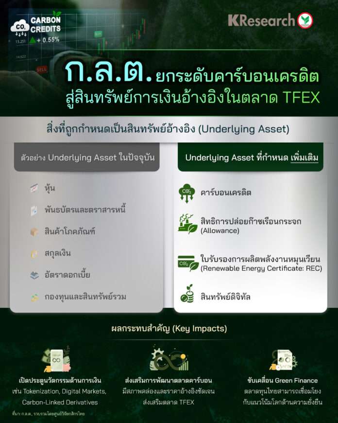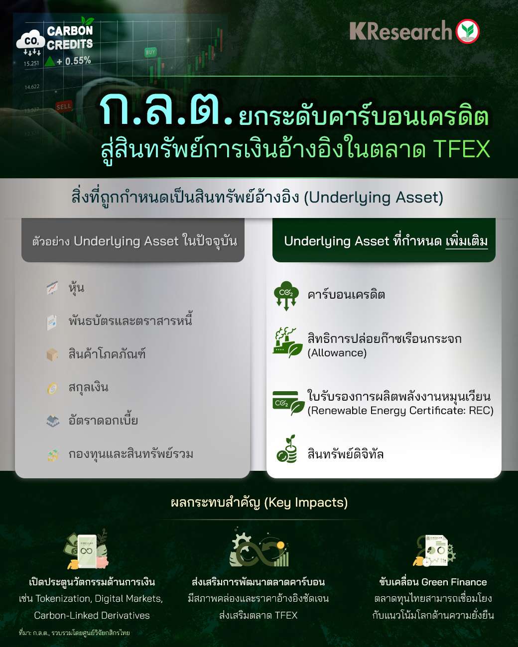 ศูนย์วิจัยกสิกรไทย ชี้ว่าจะเป็นการยกระดับให้ประเทศไทยมีโครงสร้างตลาดคาร์บอนและเครื่องมือบริหารความเสี่ยงด้านคาร์บอนในระบบตลาดทุน สร้างราคาอ้างอิงที่โปร่งใส เพิ่มสภาพคล่อง และเชื่อมตลาดไทยเข้ากับแนวโน้มตลาดคาร์บอนโลก