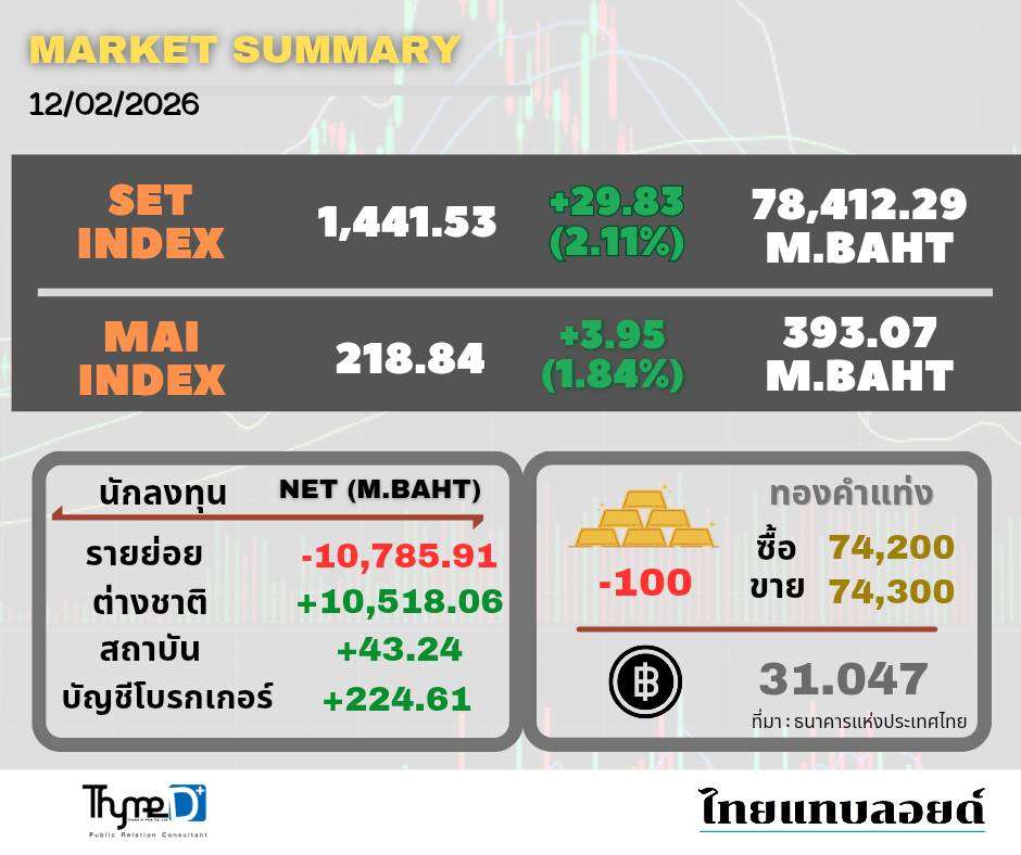 SET ปิดวันนี้ที่ 1,441.53 จุด เพิ่มขึ้น 29.83 จุด (+2.11%) มูลค่าซื้อขาย 78,412.29 ล้านบาท