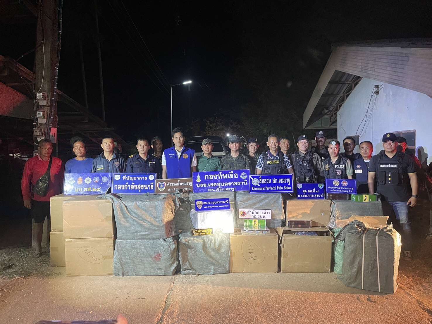 พลเรือตรี ปารัช รัตนไชยพันธ์ โฆษกกองทัพเรือ เปิดเผยว่า เมื่อวันที่ 12 กุมภาพันธ์ 2569 เวลา 18.00 น. หน่วยเรือรักษาความสงบเรียบร้อยตามลำน้ำโขง (นรข.) เขตอุบลราชธานี ได้บูรณาการร่วมกับหน่วยงานความมั่นคงในพื้นที่ ดำเนินการสกัดกั้นและปราบปรามขบวนการลักลอบค้าสินค้าผิดกฎหมายตามแนวลำน้ำโขง ตามการบังคับใช้กฎหมายว่าด้วยศุลกากร โดยเจ้าหน้าที่ได้เข้าตรวจสอบบริเวณภายในบ้านร้าง เลขที่ 26 หมู่ที่ 4 บ้านบุ่งขี้เหล็ก ตำบลนาแวง อำเภอเขมราฐ จังหวัดอุบลราชธานี พบของกลางเป็นบุหรี่ต่างประเทศ (ประเทศจีน) ซึ่งลักลอบนำเข้ามาในราชอาณาจักรโดยไม่ผ่านพิธีการทางศุลกากร จำนวน 23 ลัง ทั้งนี้ ไม่พบตัวผู้กระทำความผิดในที่เกิดเหตุ ซึ่งเชื่อว่าเป็นการกระทำในลักษณะของเครือข่ายลักลอบค้าสินค้าผิดกฎหมาย โดยเจ้าหน้าที่ได้ตรวจยึดของกลางทั้งหมด และนำส่งกลับไปยัง บก.นรข.เขตอุบลราชธานี เพื่อดำเนินการตรวจสอบโดยละเอียด และขยายผลตามขั้นตอนของกฎหมายต่อไป